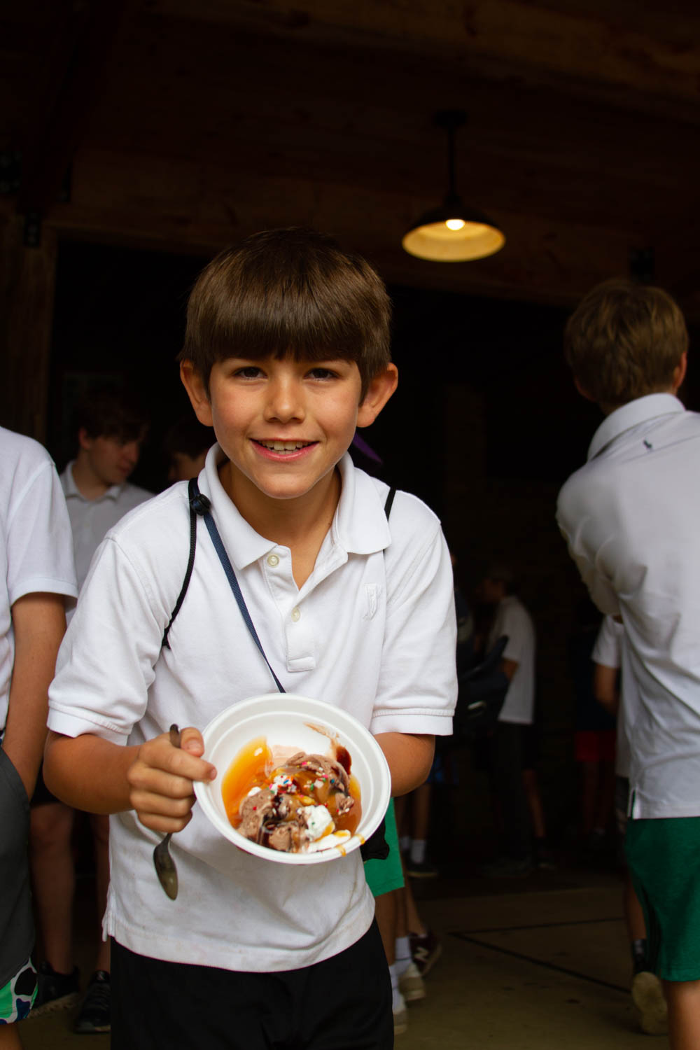 Yesterday was Sunday, a more relaxed day at camp where we have extra time to rest, clean, worship, and choose unique Special Signups. To start the day, we slept in an extra hour, and enjoyed Krispy Kreme doughnuts at breakfast. Boys make sure their cabins are tidy every day for cabin inspection, but Sunday cabin inspection is a bigger deal. They have more time to clean because directors are the ones checking the cabins, and they do an “open trunk” check to make sure they’re storing their clothes in a neat way. The other big reason for making sure your cabin is clean? The cleanest cabins get to go first in the ice cream sundae line!