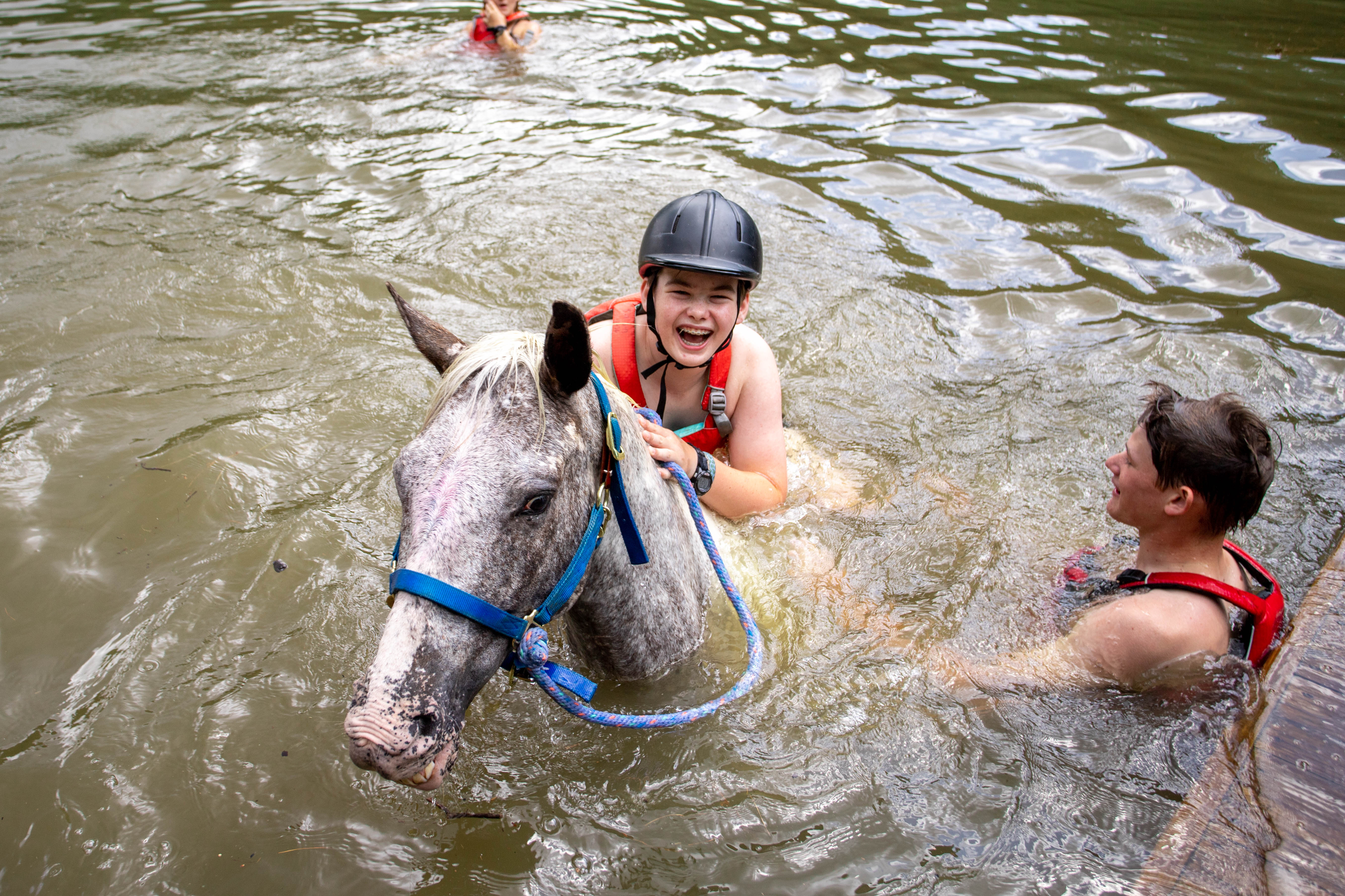 As the group rode down to the lake, they had to take turns getting in the water so it wouldn’t be too crowded. One of our first-year counselors, Beck, had been looking forward to swimming with the horses for a long time. Kyle was lifeguarding them, and said that Beck displayed her Moral Compass by making sure all the campers had their time in the water first, before finally getting the chance to go in herself. It would have been far easier and more fun to just go immediately splashing in, but she knew the right thing to do was to wait and give everyone else a turn first!