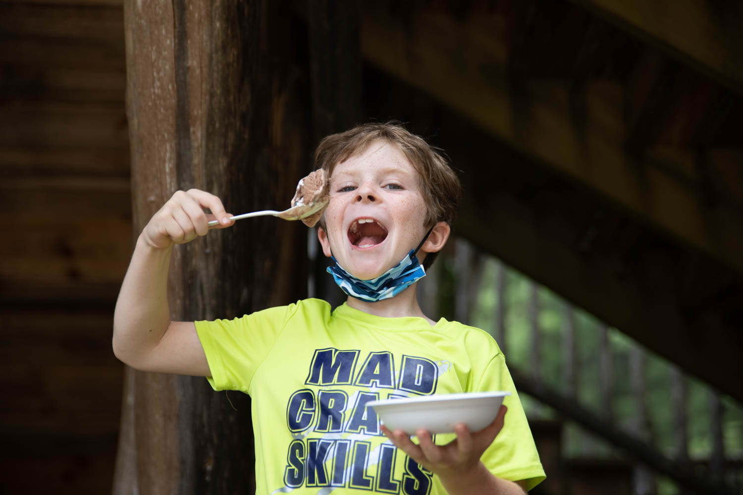 Every Sunday we enjoy a favorite lunch meal of fried chicken, mashed potatoes, green beans, and warm rolls. Though it’s always tasty, after lunch comes the real treat. We get to enjoy ice cream sundaes with plenty of toppings! Campers are called to line up based on their average cabin inspection scores from the past week, with the cleanest cabins getting awarded a front spot in line. We had chocolate, vanilla, and strawberry ice cream, plus sprinkles, strawberries, fudge sauce, caramel, and whipped cream on an outside ice cream bar. It is definitely a highlight of the week.