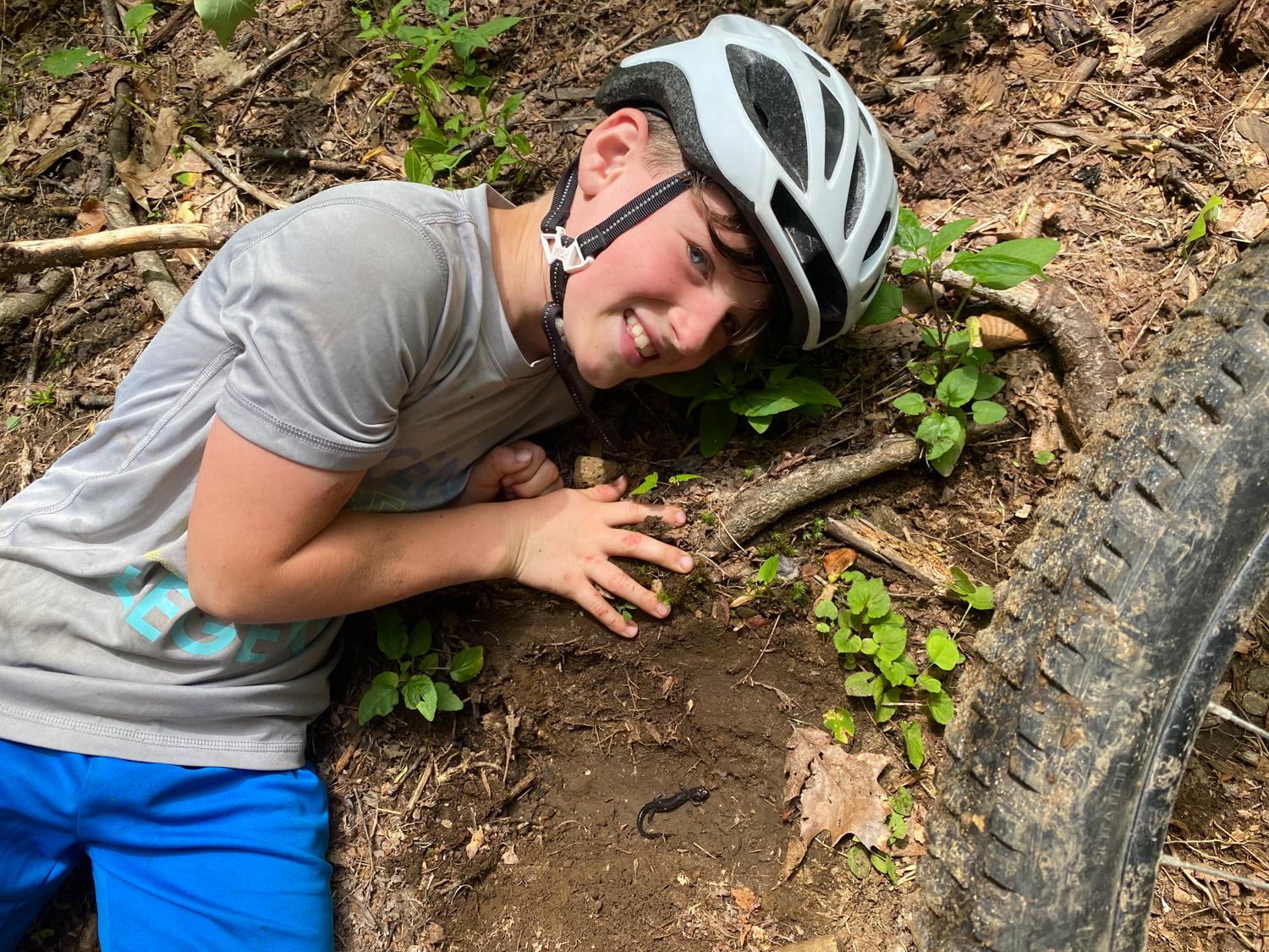 On these trips out of camp, boys also get to enjoy tent camping and gain a deeper appreciation for the natural world. Henry took a photo next to a salamander they found on the trail. “It looked like a toy!” Henry said, because of how huge it was. They spotted the salamander after Hays rode over a rock, which flipped up from his back tire. After admiring the salamander for a bit, they put the rock back and continued on their ride, keeping an eye out for more cool nature moments.