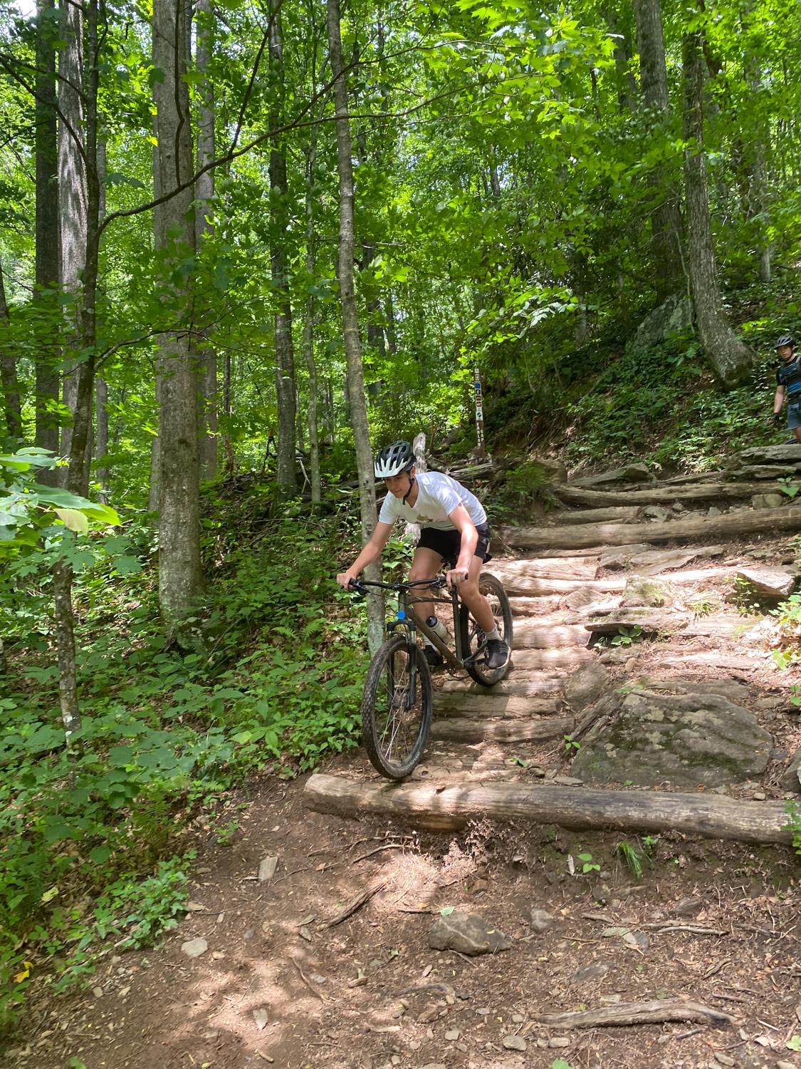 Last week, an advanced group of mountain bikers took a 3-day trip to Pisgah, using the North Mills River Campground as their base. “It was hard, but really fun,” said Phillip. He described the challenge of the rocky and technical trails, which Pisgah is known for. “The last trail we did, Lower Black Mountain, was really cool because it was smooth and it was downhill.” He said that was the best part of the trip because it was such a fast and flowy trail compared to all the others.