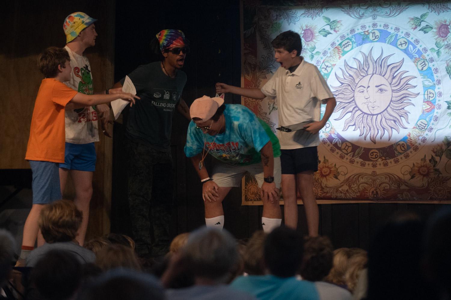 Aside from the counselors’ musical talents, camper Daniel D. shared his piano skills with us! He played the “Mission Impossible” theme song. We also got to see the comedic talents of several campers, starting with Tripp M. and Shaw R. who performed a skit they wrote themselves. Tripp also told several riddles to the crowd. Some of our oldest campers performed a skit as a cabin, where two of them began telling jokes so corny that the rest of the cabin ran in as the FBI and stole the joke book, which had been “wanted by the FBI because it was too cheesy.”