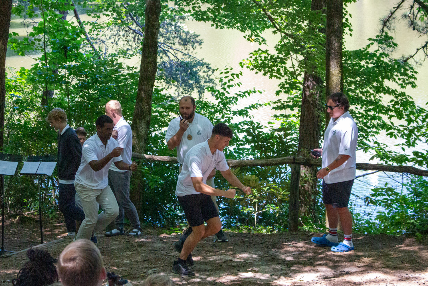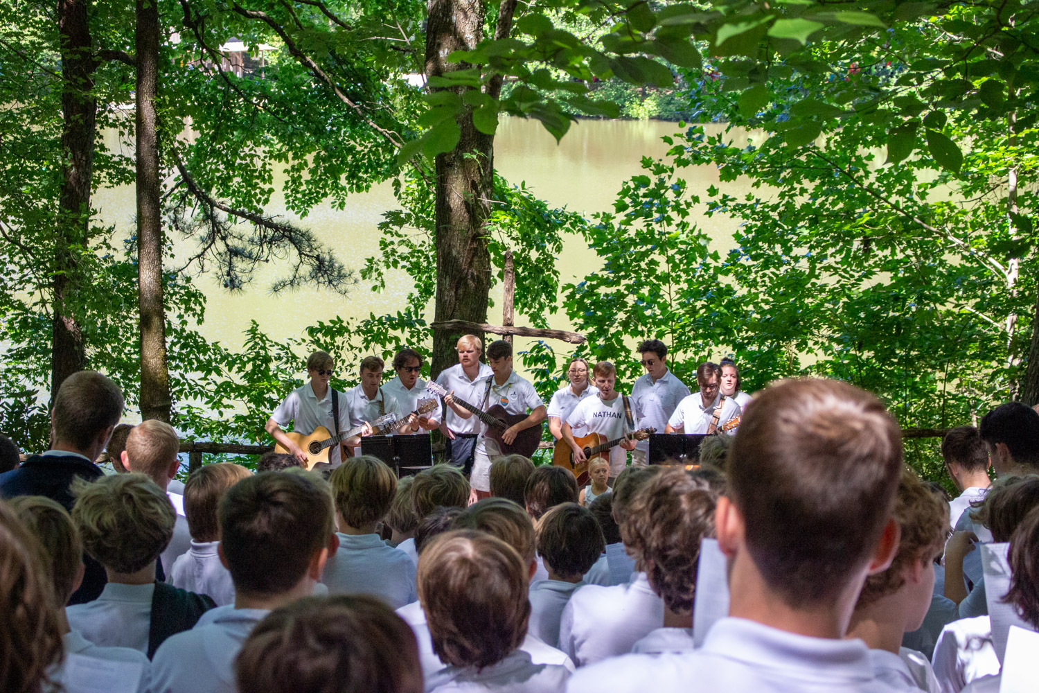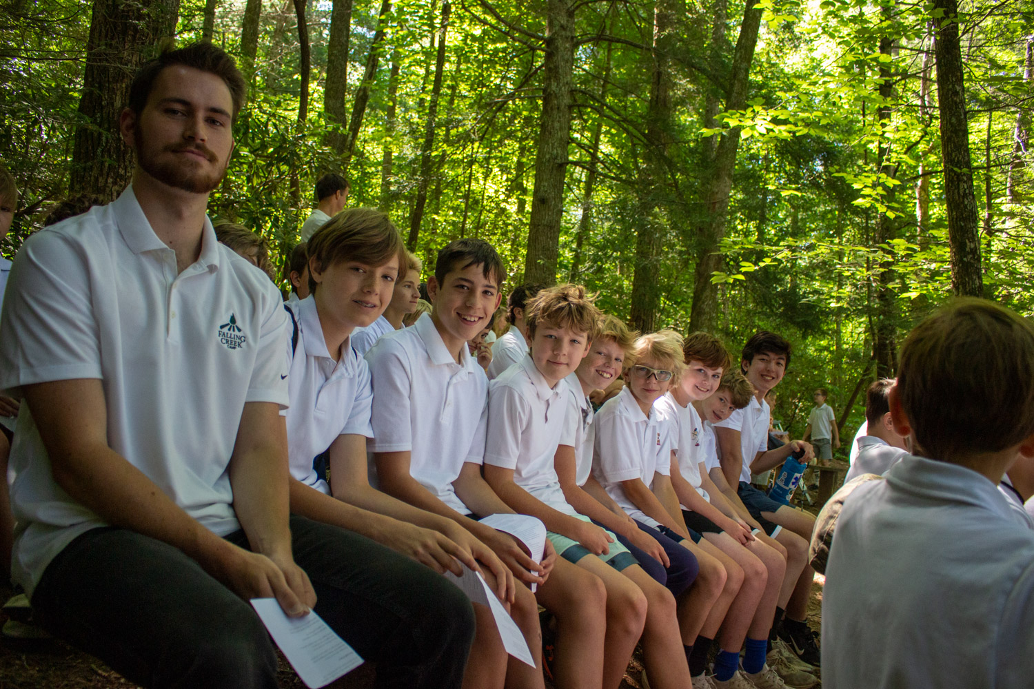 Yesterday after sleeping in, enjoying Krispy Kreme doughnuts for breakfast, and cleaning our cabins for inspection, we gathered for a quieter, more reverent time at camp. At our church service each week, everyone wears a white shirt and sits quietly in the Campfire area with their cabins. The benches by the lake provide a naturally beautiful chapel, where we all enjoy the bird song and quiet noises of nature until the service begins.