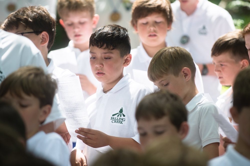 After tidying their cabin areas, everyone changed into their Sunday white shirts and headed to church service. Falling Creek is a Christian camp, but we are non-denominational and our church service is centered around common values that are important for everyone, no matter your specific faith background. Yesterday’s service continued with the theme of “courage.” Each week of camp has a theme that guides our Evening Embers discussions and our Church program. Courage was this past week’s theme, and during church, we sang songs, enjoyed skits, and talked about what it means to act with courage.