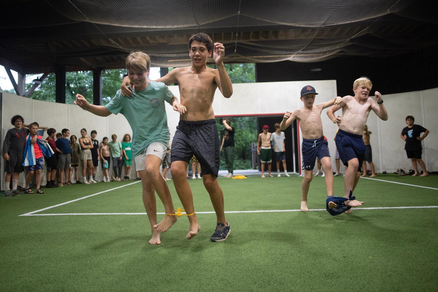 In the afternoon, we continued playing with a huge all-camp-game of Wild Wild West! This is one of the most popular games we play at camp, splitting into 4 different colored teams and using the whole camp as a “game map.” Boys are hunting for “hidden gold,” but have to watch out for fools-gold, which they might turn in to the bank unknowingly. They can also earn points by finding other hidden items around camp, and by pulling the flag belts of other teams. Boys were having a blast strategizing with teammates, pulling flags, running through the woods, and playing all afternoon.