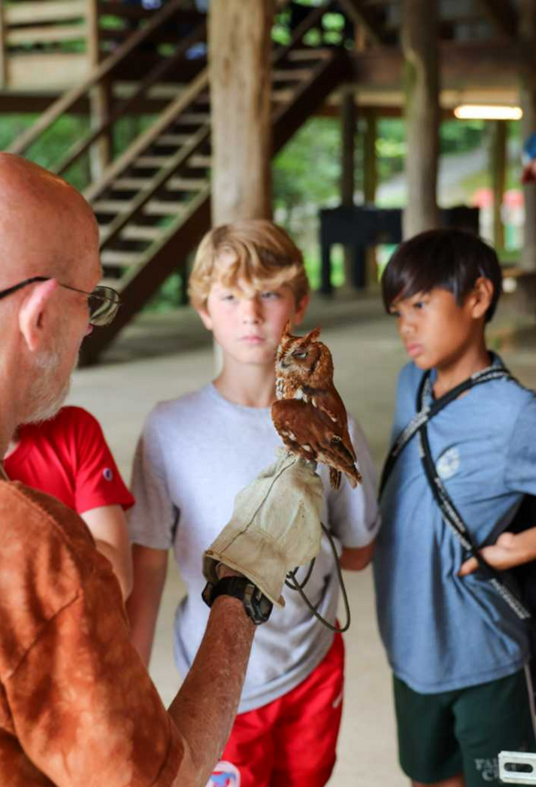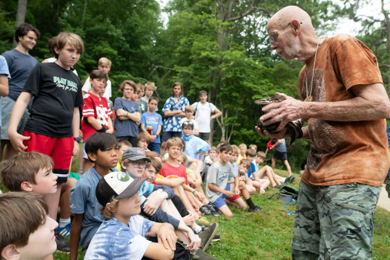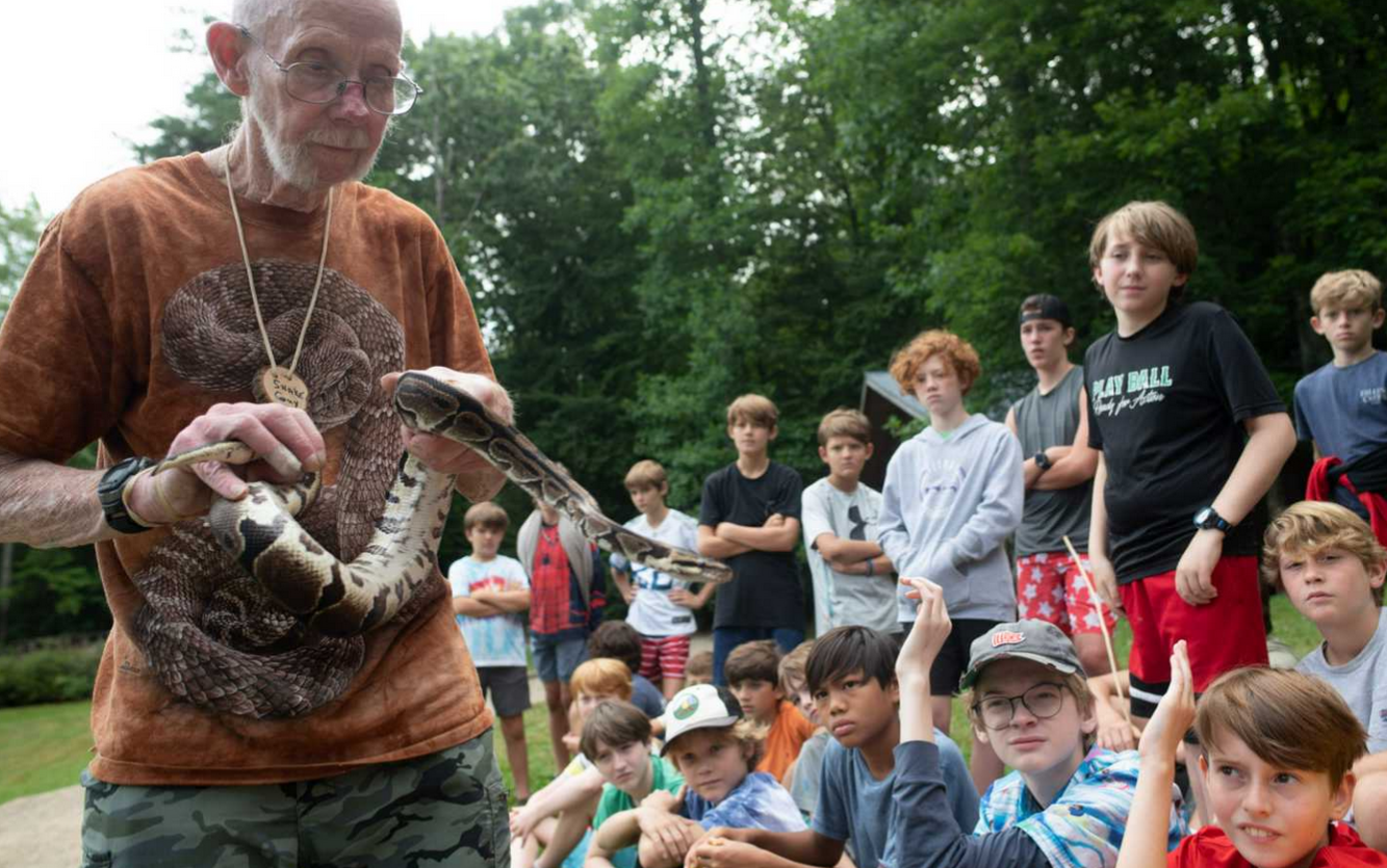 Yesterday was the final full day of activities here at camp, and we were able to pack so much in! One of the highlights was the morning’s educational animal program, led by Steve Longenecker. If you have ever been a camper before at Falling Creek, then you know Steve Longenecker. He’s known as “Father Nature,” “the WEMA guy,” “the Snake Guy”, “the Bird Man,” “the Lump Guy,” (for his fried dough Longenecker Lumps) and mostly, SFL. SFL has been part of the Falling Creek community since the 70s, consistently educating boys in wilderness emergency medical aid (WEMA), leading climbing trips, and hosting snake and falconry programs with his birds of prey and snakes.
