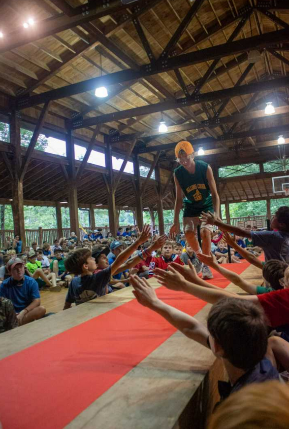 Finally, before dinner we gathered for the Awards Show, to celebrate the outstanding efforts of the campers. Nuckles was the host, wearing a button down and tie for the occasion! It was a “black tie event”, with clip-on bowties for all the campers and staff to wear, as well as a red carpet that boys receiving their awards walked down. Each activity recognized up to three boys for going above and beyond this session, and the FLINT, STEEL, Ironman participants, Honor Council members, and Journeymen/Keepers of the Flame were also awarded Waypoints. It was great to see all the encouragement, recognition, and celebration the campers gave each other.