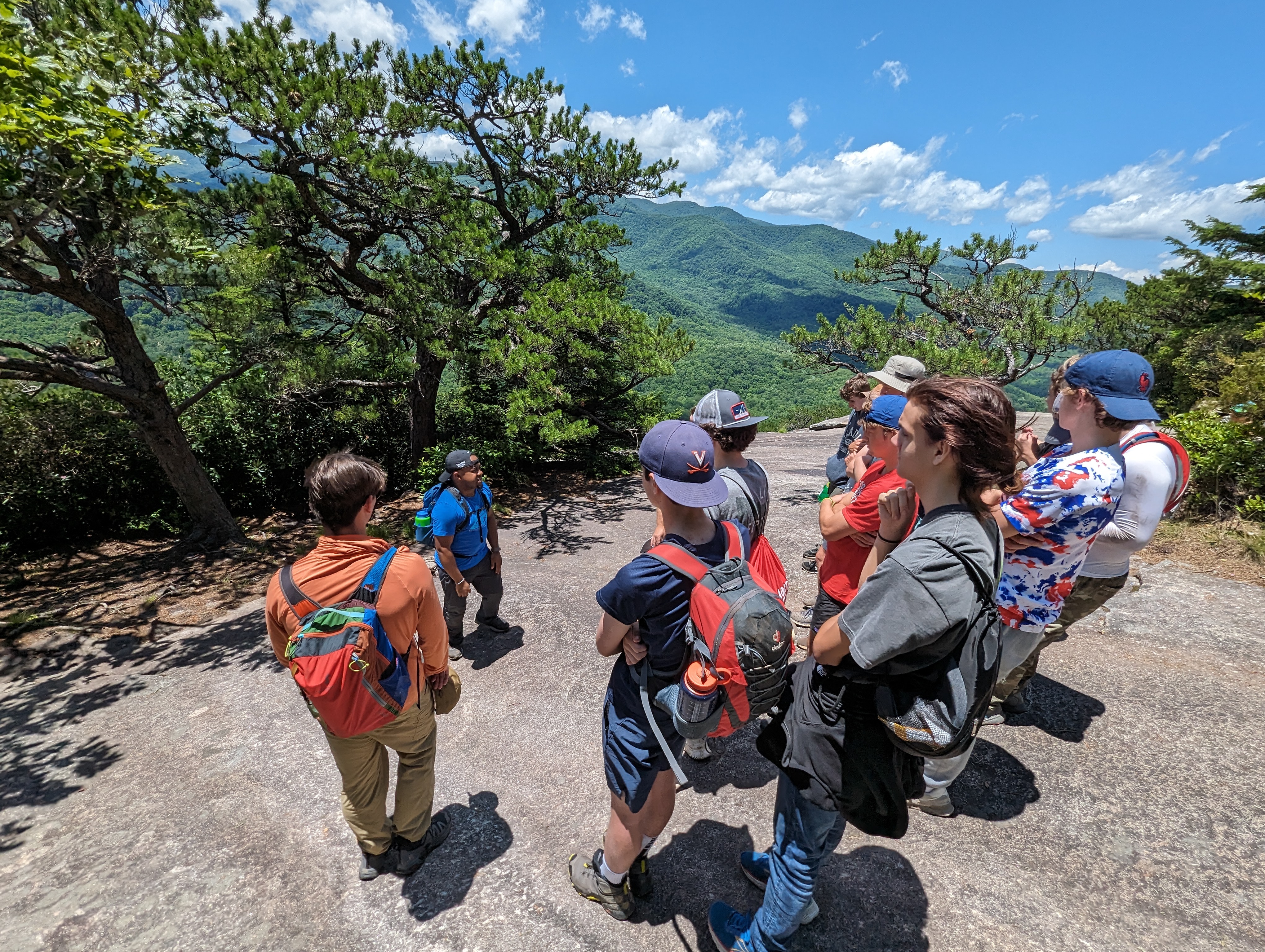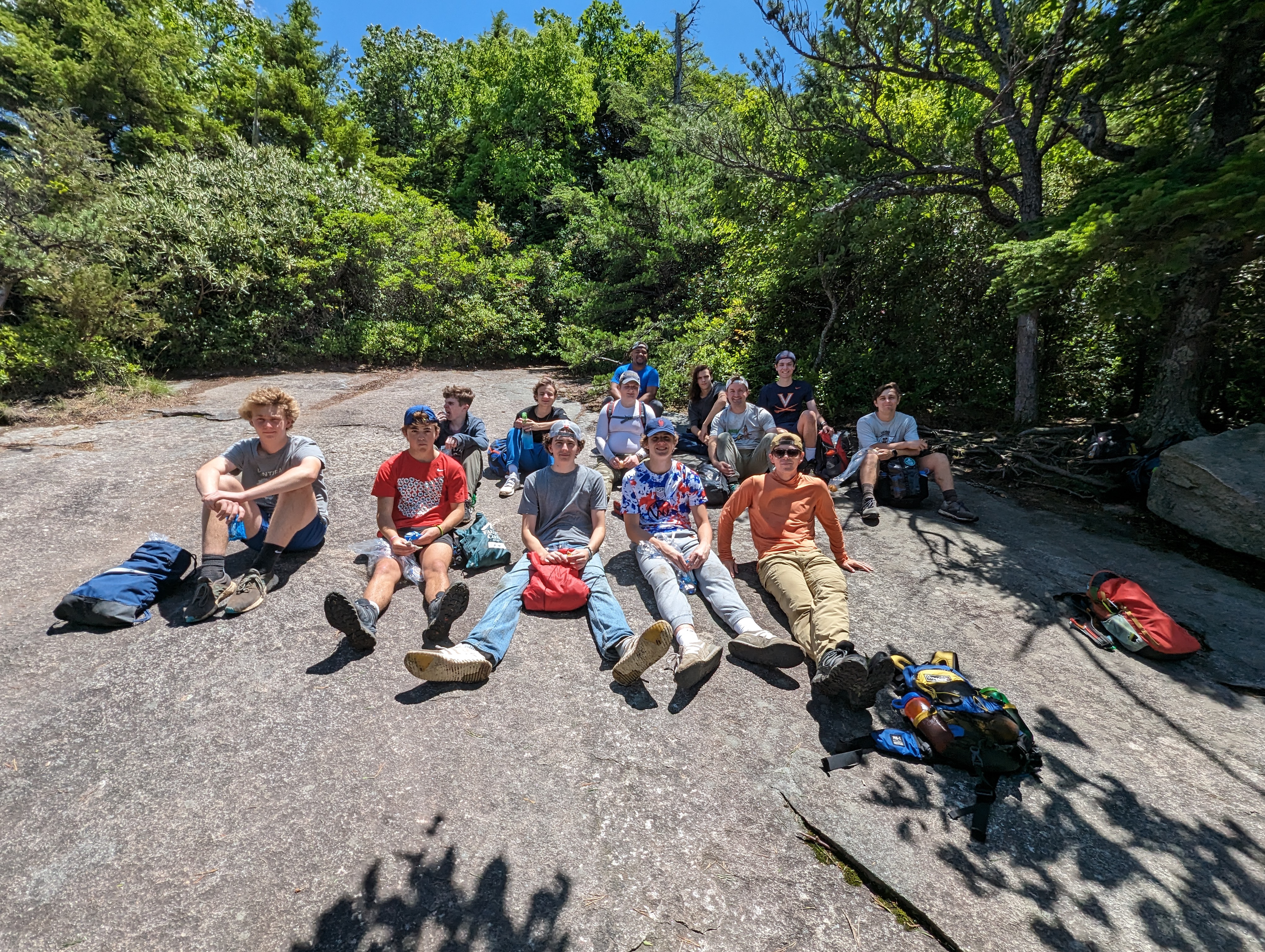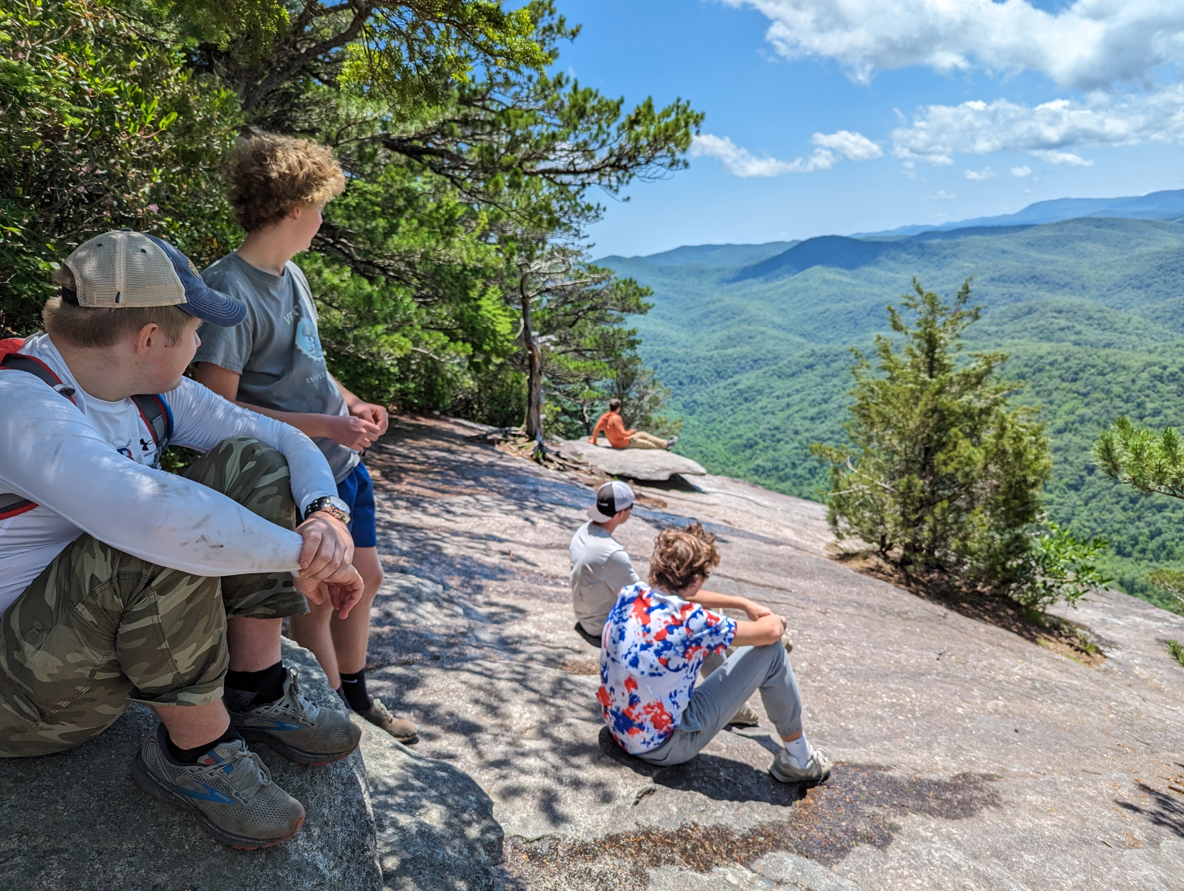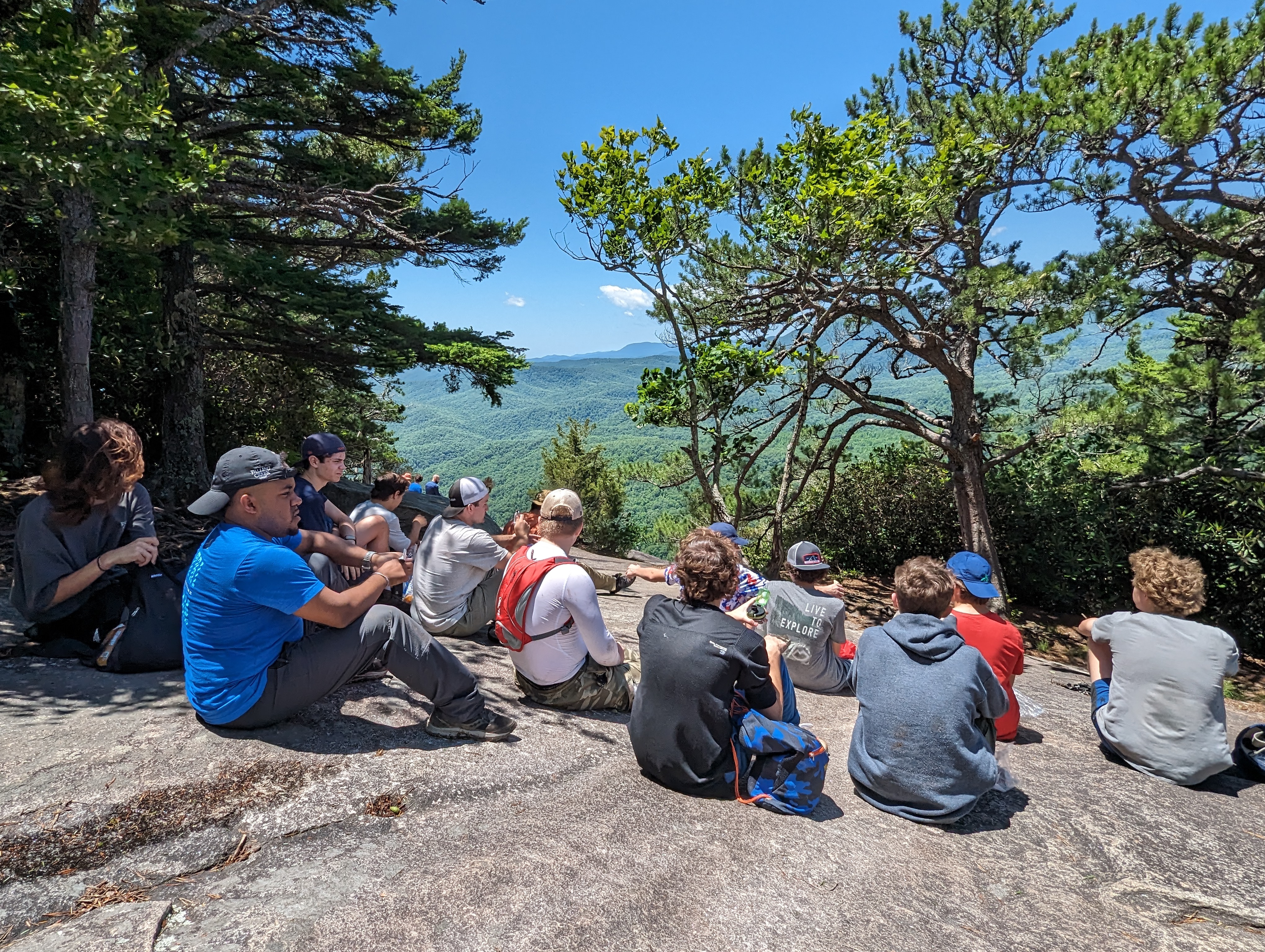 On Monday, Yates Pharr and John Allen led the group of young men, along with FLINT advisor Zach Rivera, and cabin counselors Frankie Wimbish and Pat Greenwood. They provided encouragement and support along the way during the steep and challenging sections of the hike. John said that trying to keep traction up the tough climbs was like “trying to walk around like a cat.”
