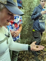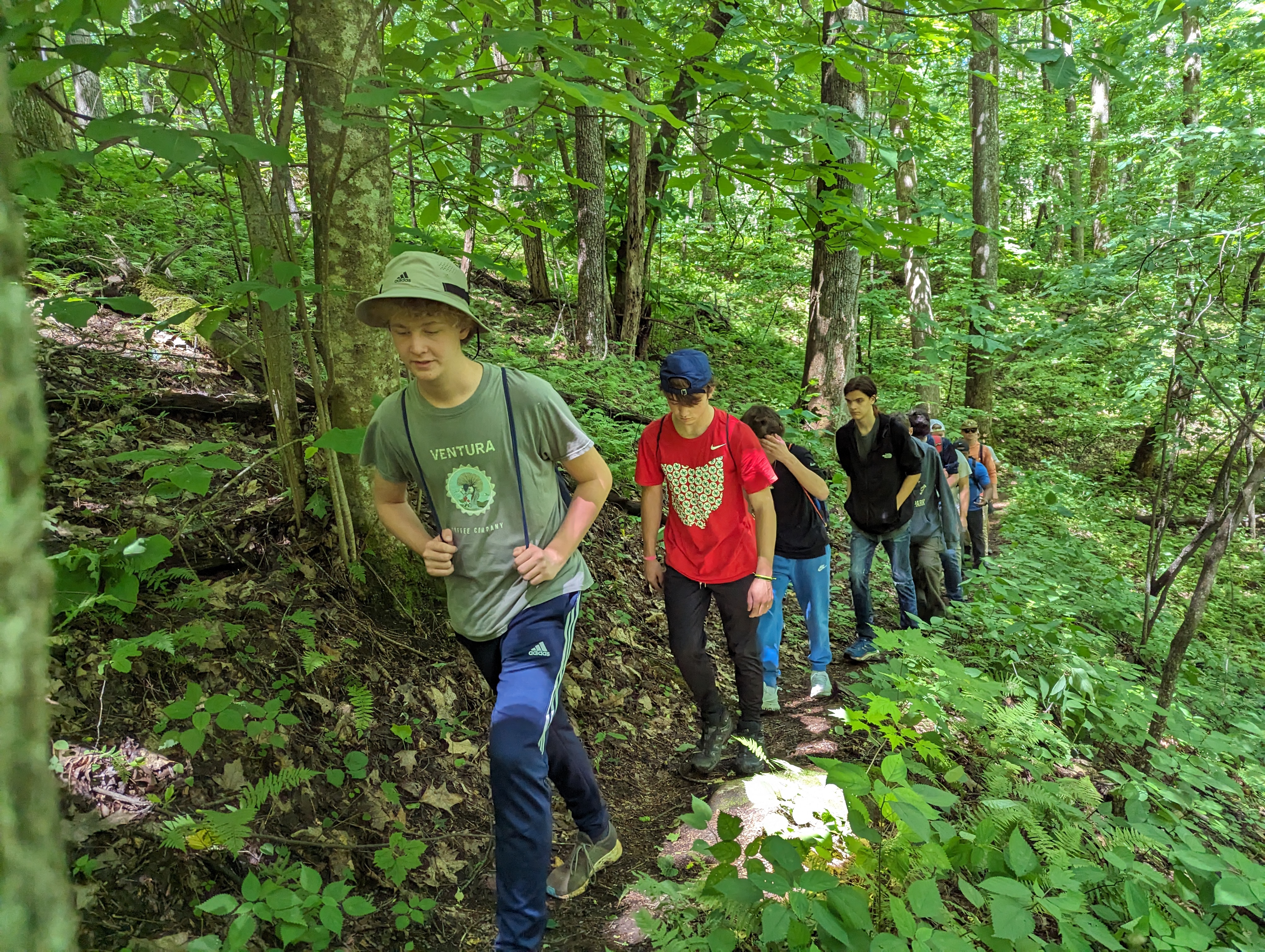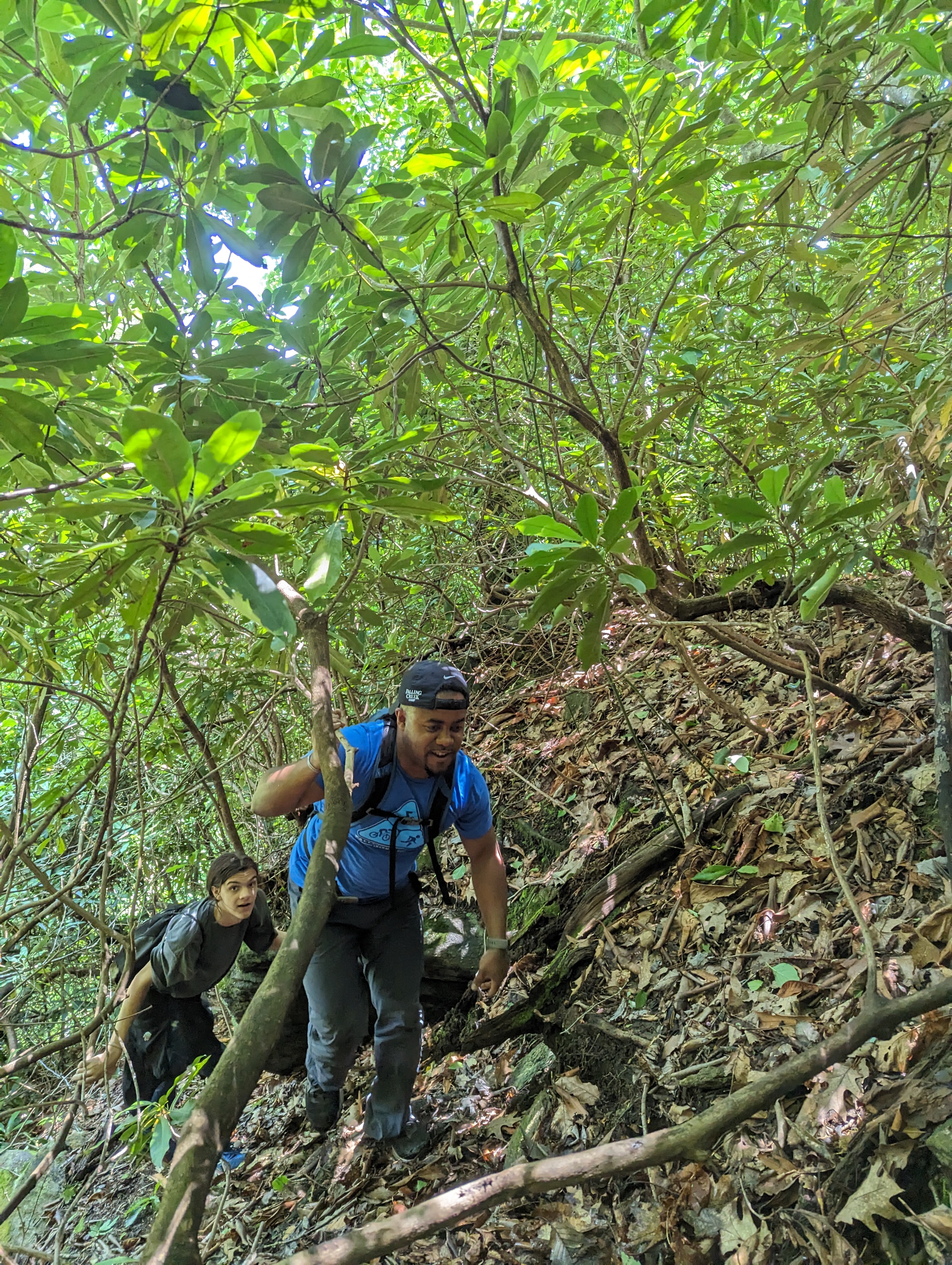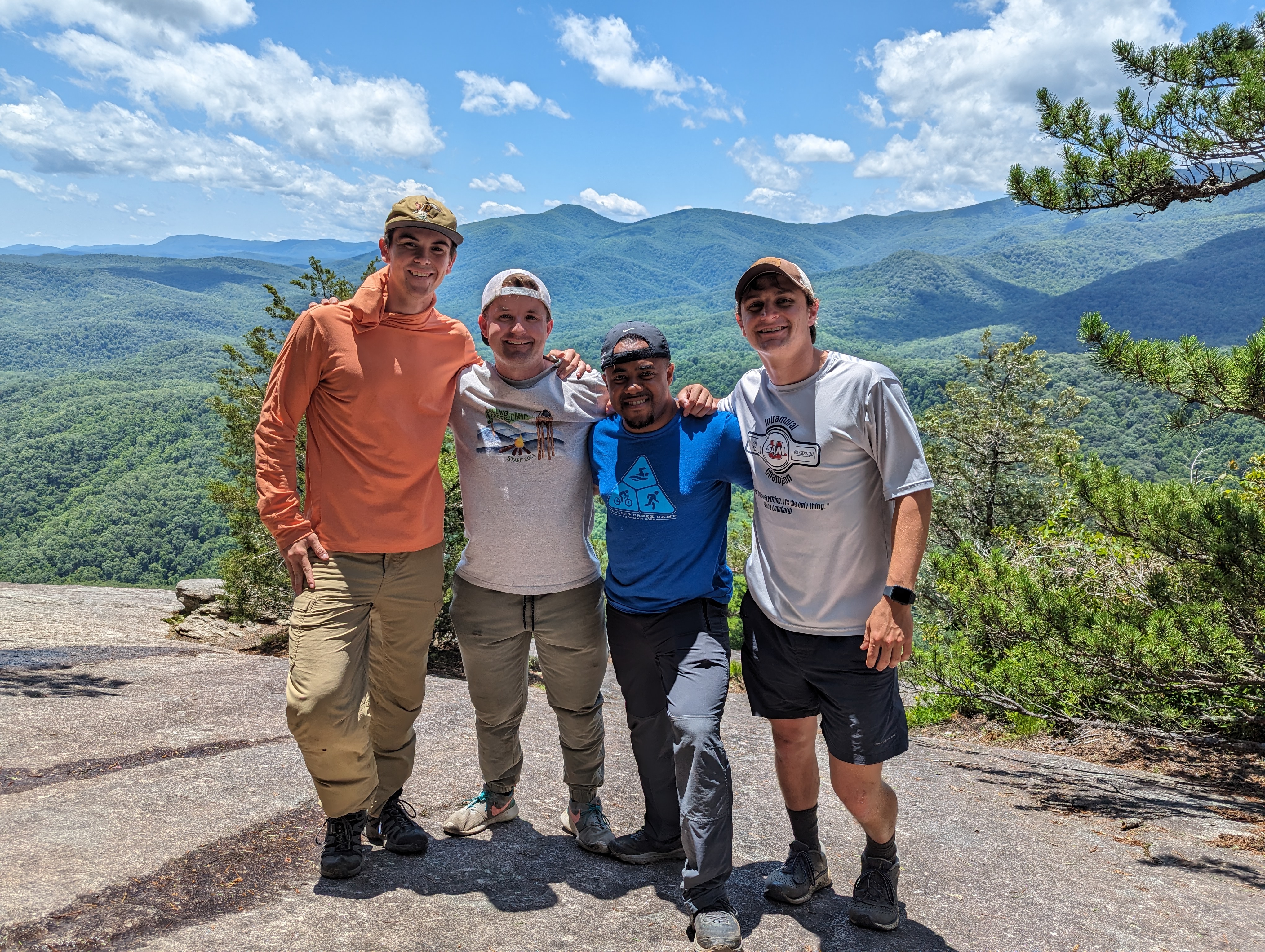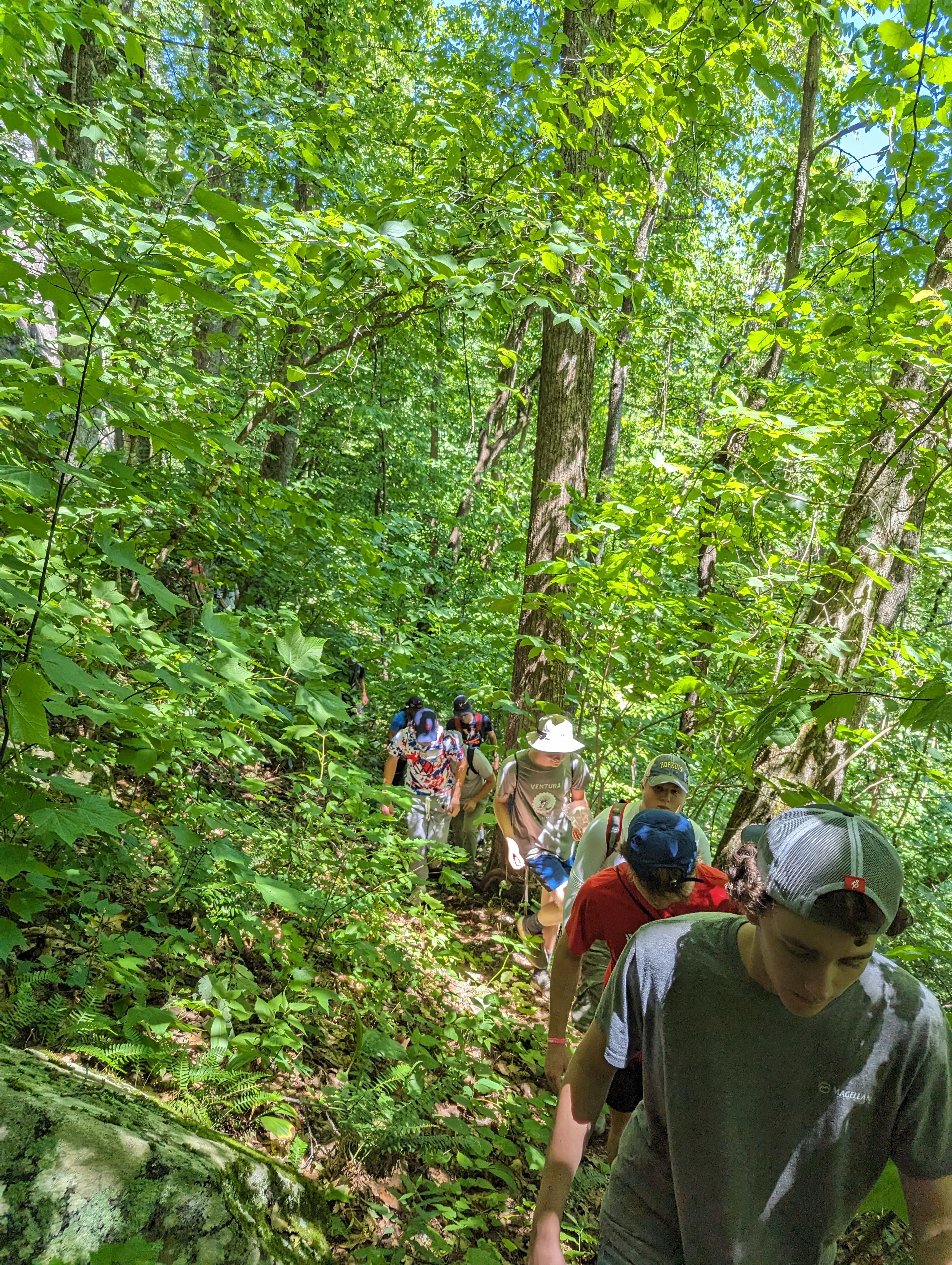 On Monday, Yates Pharr and John Allen led the group of young men, along with FLINT advisor Zach Rivera, and cabin counselors Frankie Wimbish and Pat Greenwood. They provided encouragement and support along the way during the steep and challenging sections of the hike. John said that trying to keep traction up the tough climbs was like “trying to walk around like a cat.”