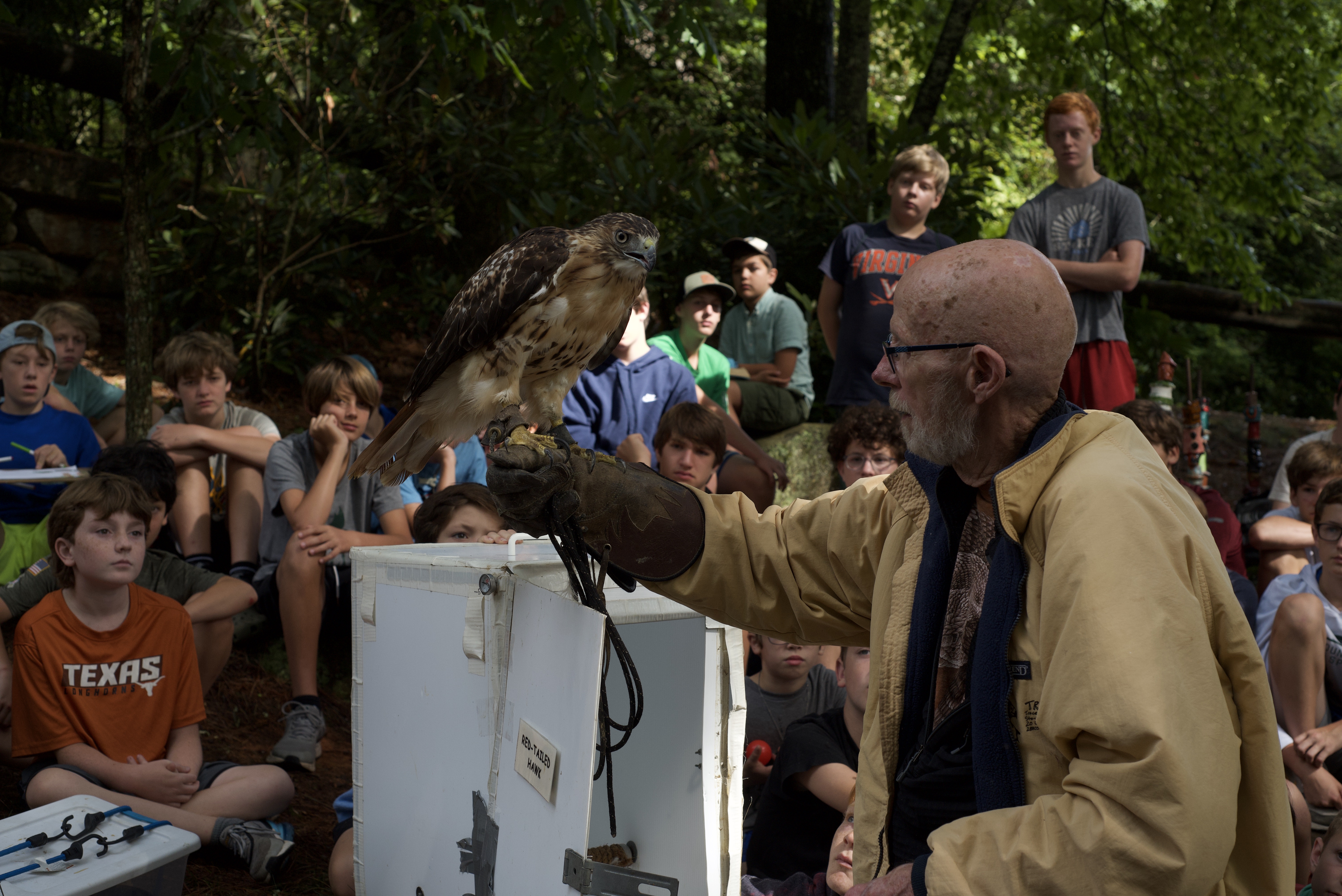 Steve Longenecker also brought native snakes and birds of prey for a special educational program during the morning. Steve (known at camp as SFL) has been a long time outdoor educator, nature enthusiast, falconer, rock climber, and “lump chef” at Falling Creek since 1975. The boys loved getting to learn about rattlesnakes, copperheads, red tailed hawks, and screech owls, gaining a greater appreciation for the wildlife native to this area.