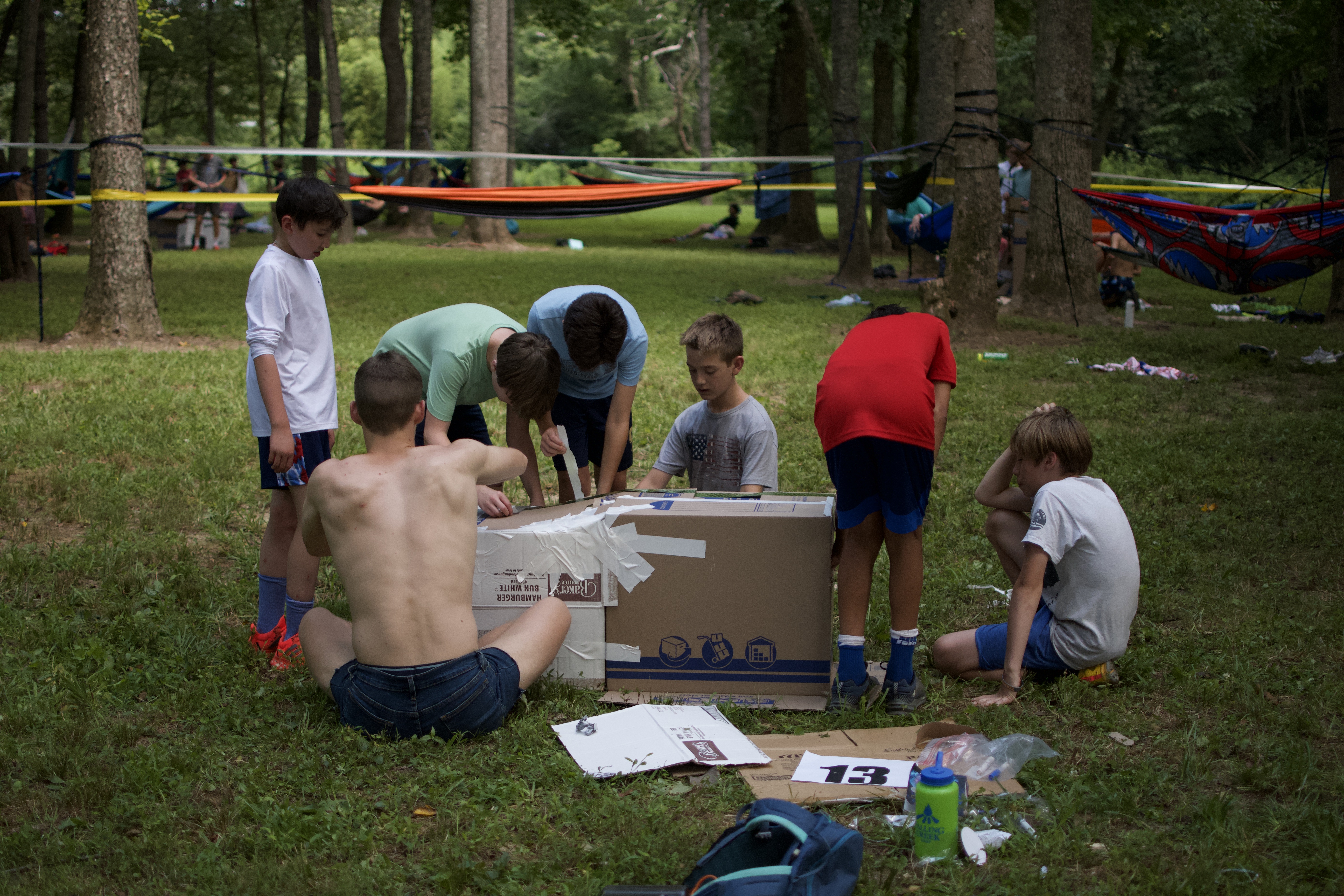 Each cabin had to work together to build a fancy limousine out of cardboard boxes to compete against other cabins in their Line. Four campers had to fit inside a completely closed cardboard limo, complete one lap together, and switch out in the pit lane for the other four campers to complete the final lap. There were some creative cars, and lots of laughter as the racers ran around the track trying to be the first to finish!