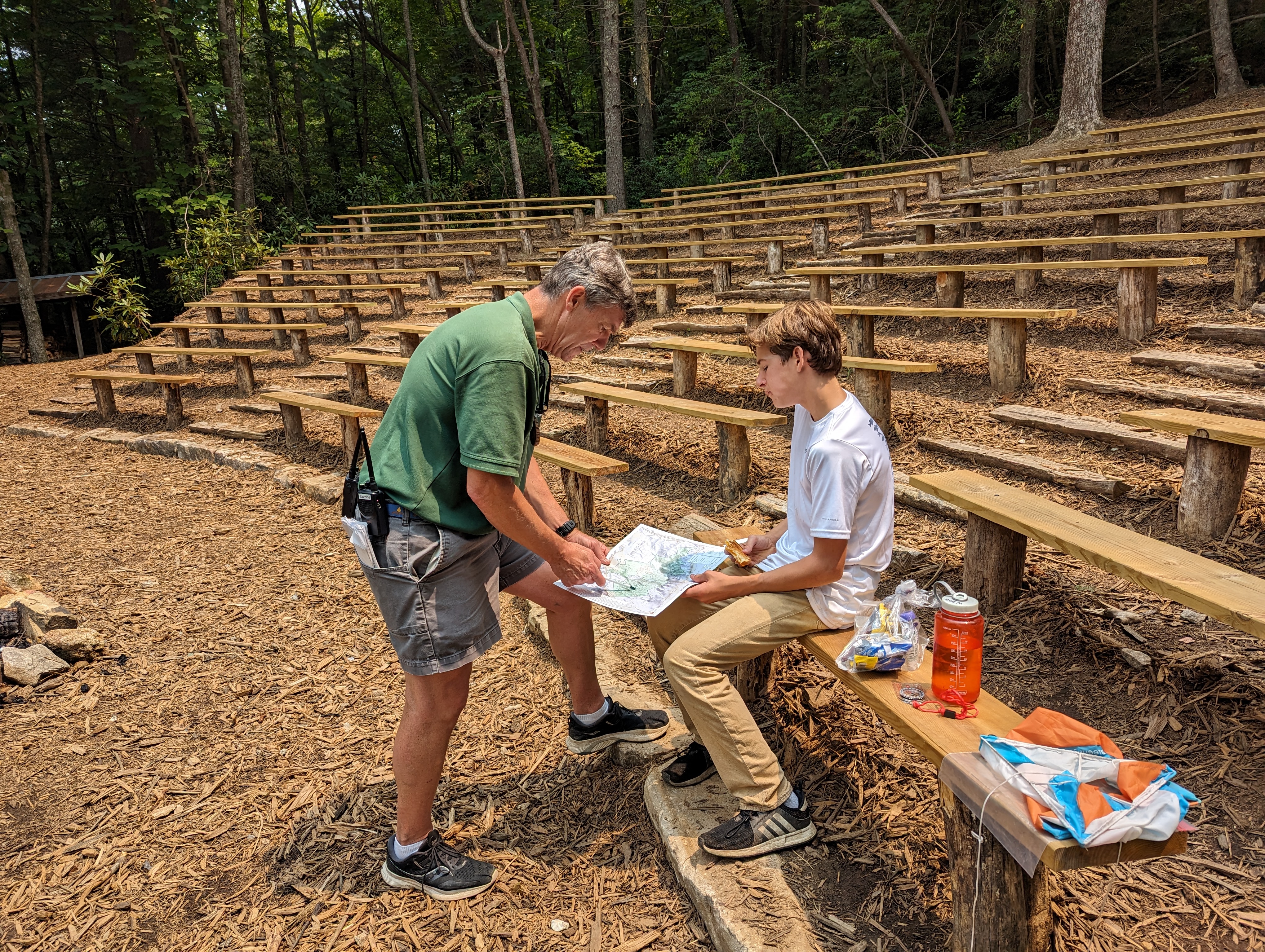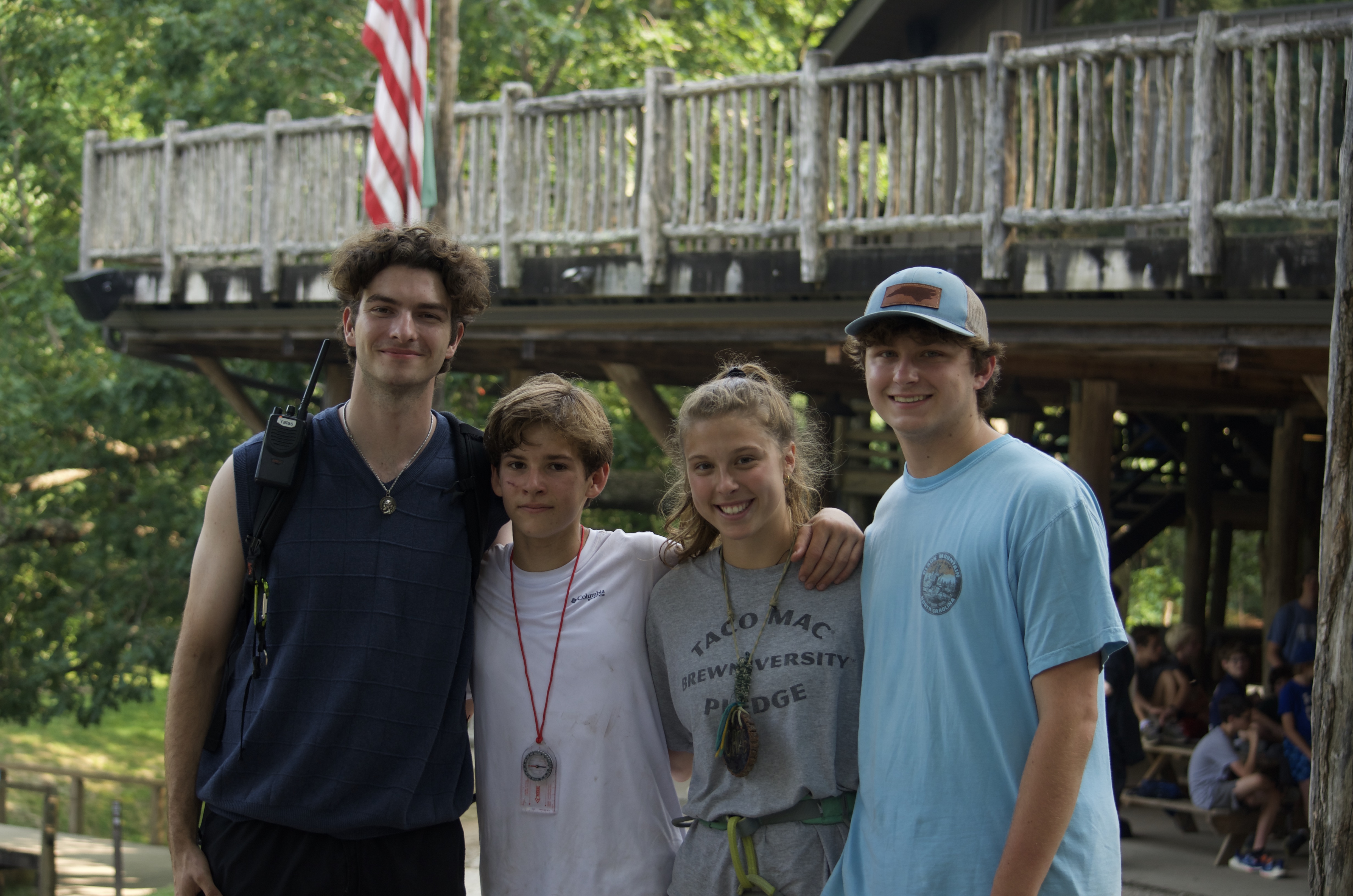 The orienteering challenge is the final test, and it’s a challenge to find all the hidden checkpoints across varied terrain within the time limit. However, William was able to persevere and found all the points before the time ran out! He returned to the bell to meet Yates, and was greeted by a congratulatory hug from Care Smyth, the staff member he chose as his Mentor! Friends flocked over to celebrate William’s accomplishment, as well as John Stanfill, a former camper turned staff member who is a Keeper of the Flame himself.