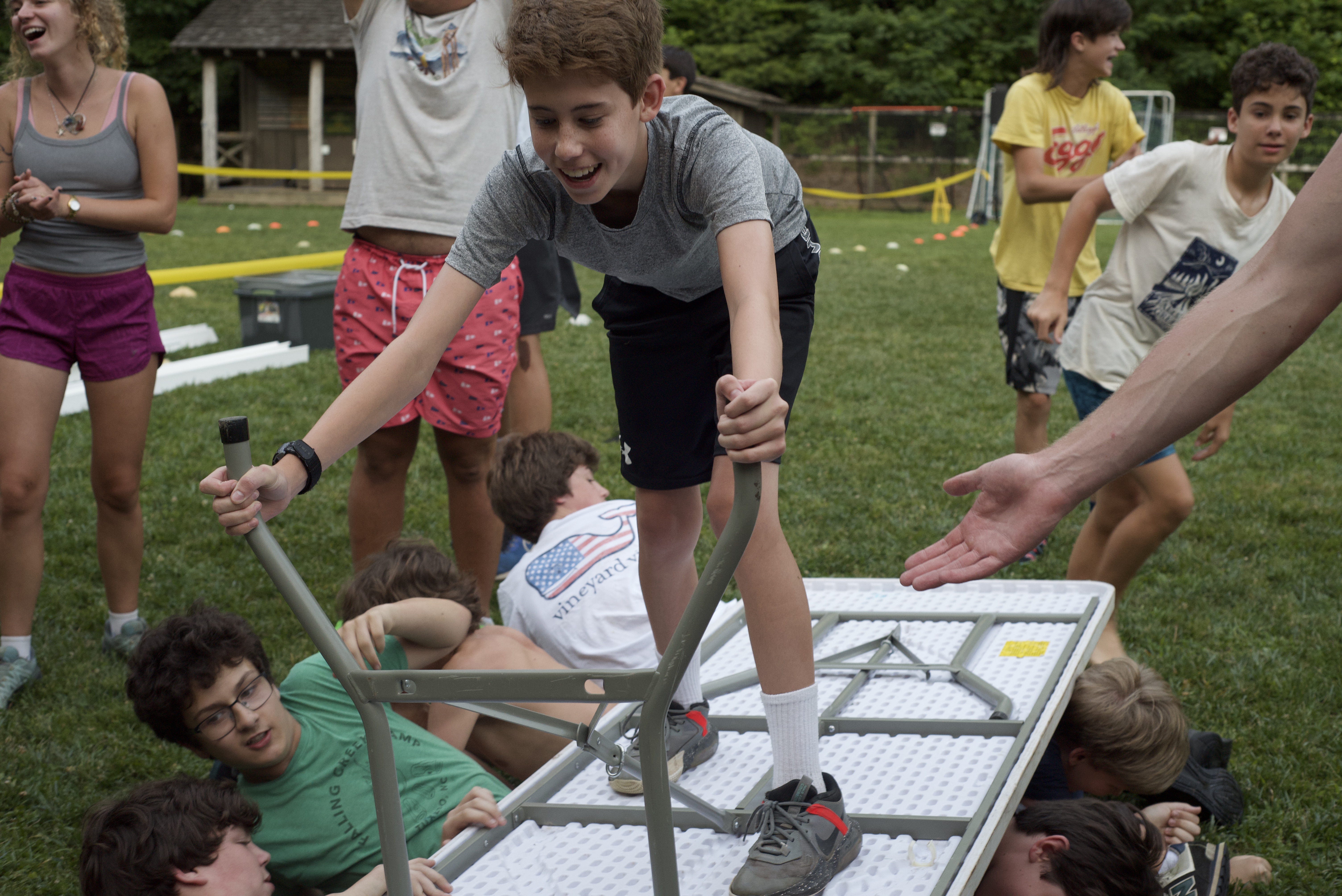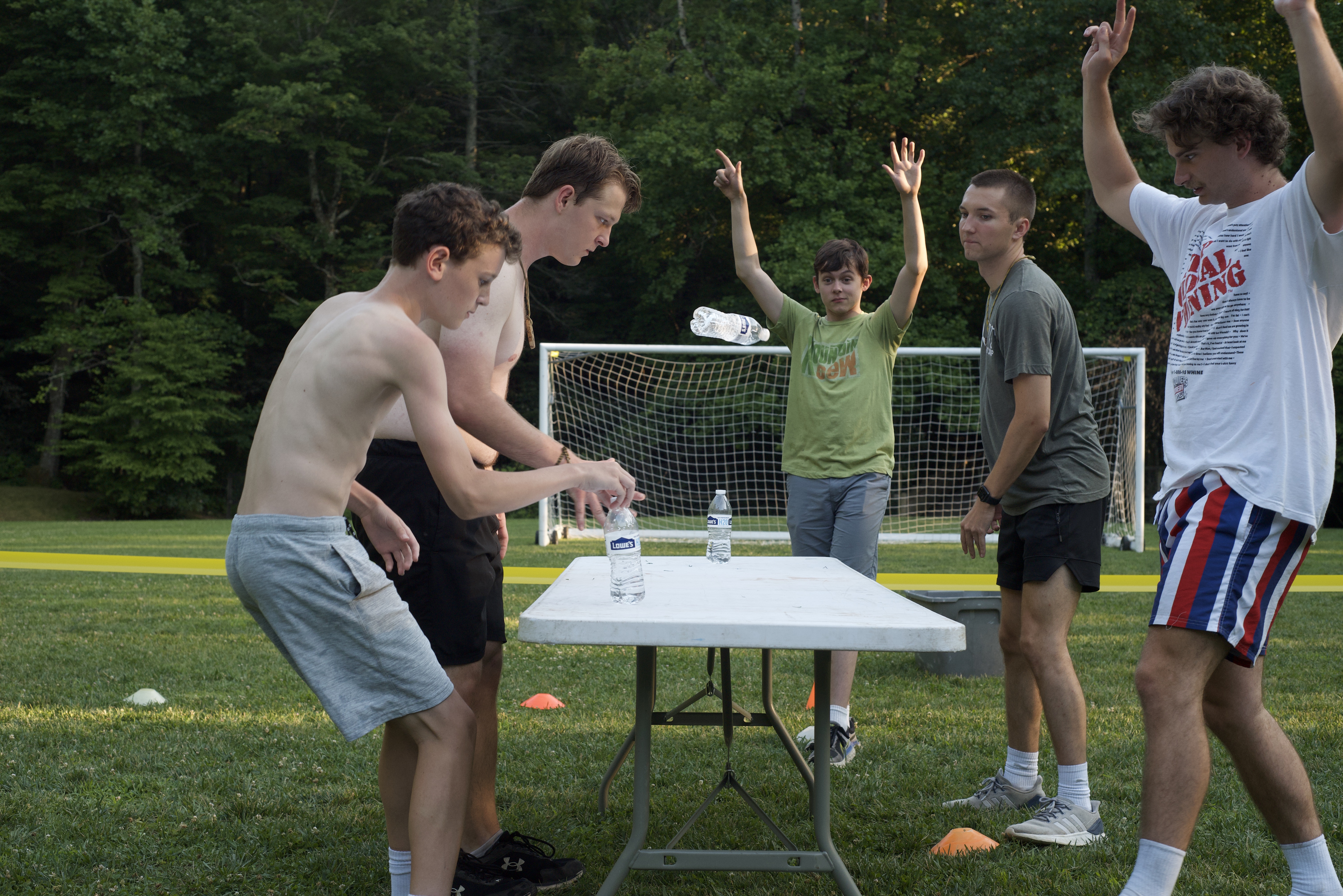 For Spit Take, the two team captains sat across from each other while opposing team members tried to make them laugh and spit the water out of their mouth. Campers could also help make jokes! They used prompts like: