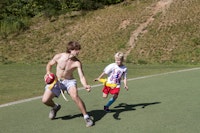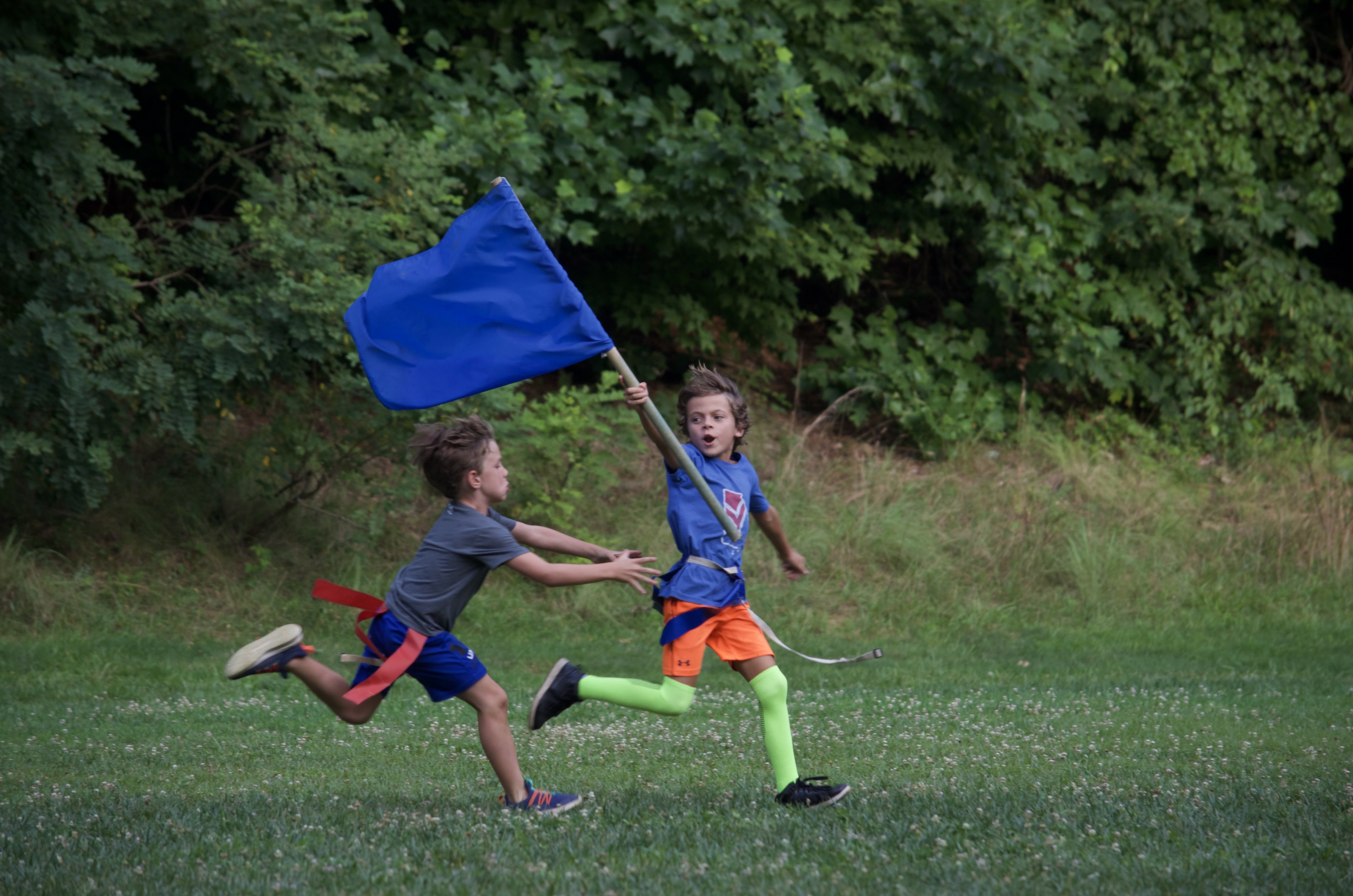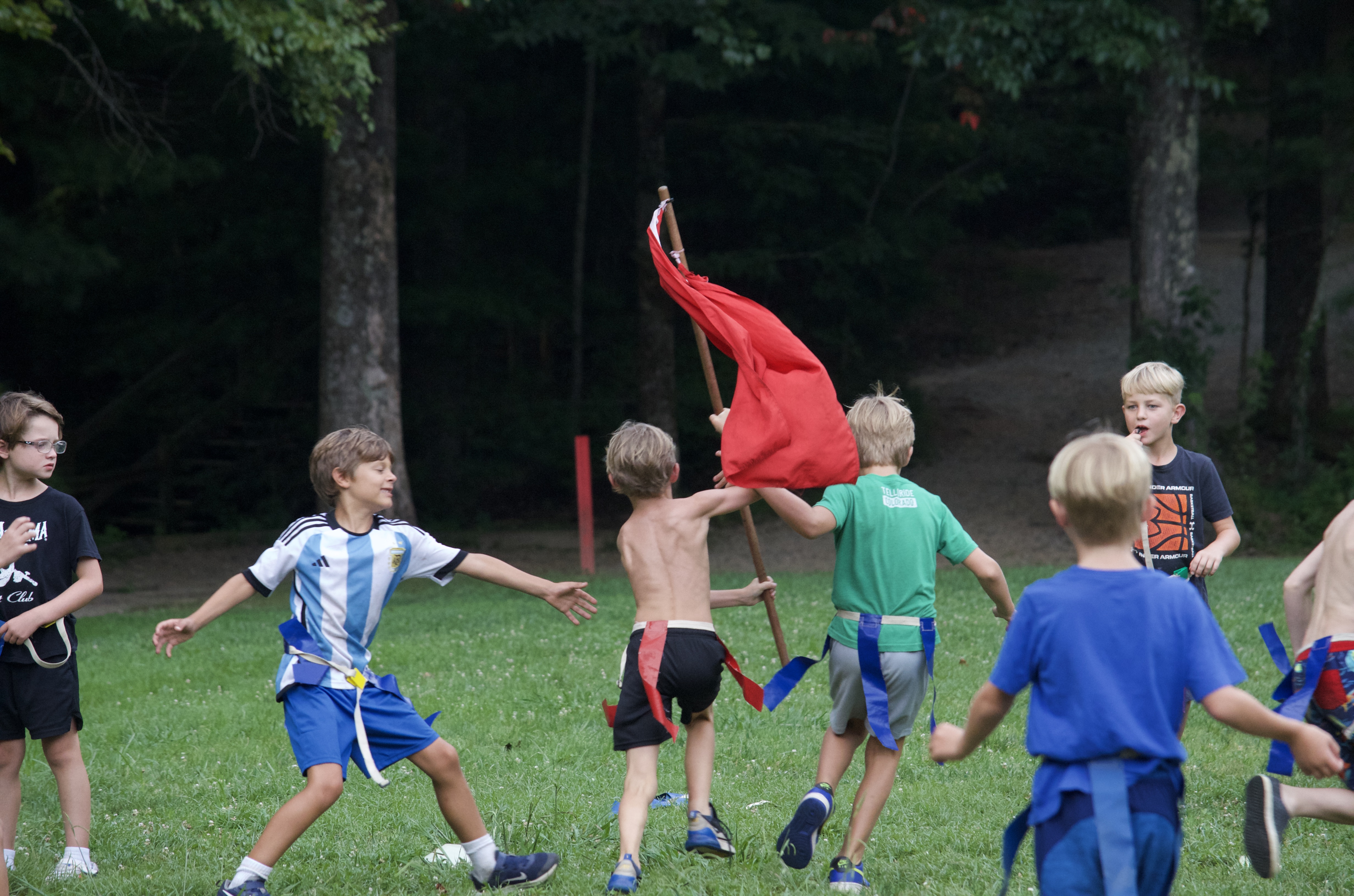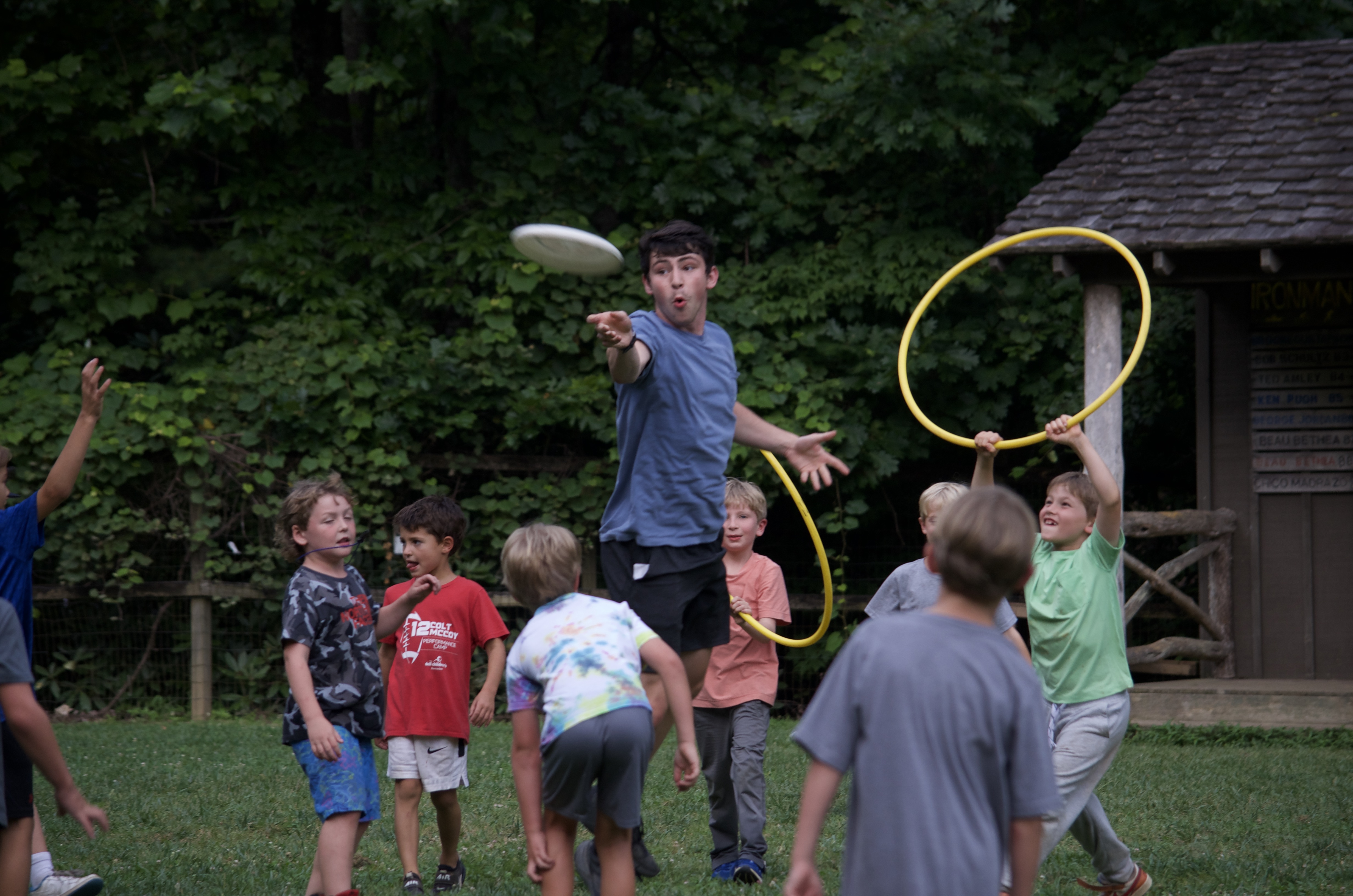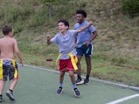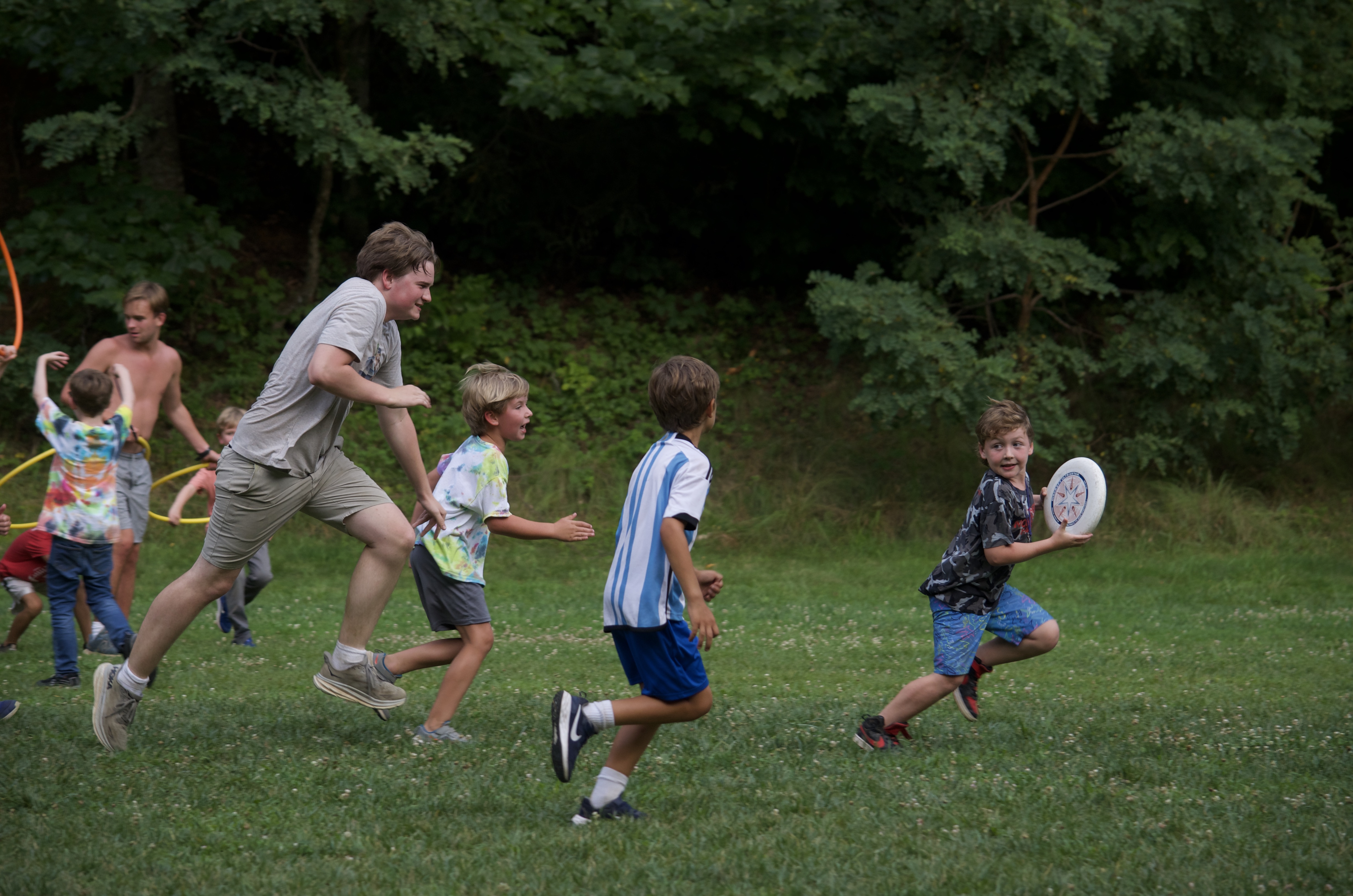 Meanwhile, our Sorrel and Tsuga cabins played on the landsports field. They enjoyed TacoCat, a fun mix of ultimate frisbee and capture the flag. The goal is to take the opponent’s flag back to your side, however if your flag belt gets pulled while trying to retrieve the flag, you go to jail. A full jailbreak happens when a frisbee gets thrown into the opponents’ goal. A frisbee caught by an individual in jail results in just that player’s release from jail.