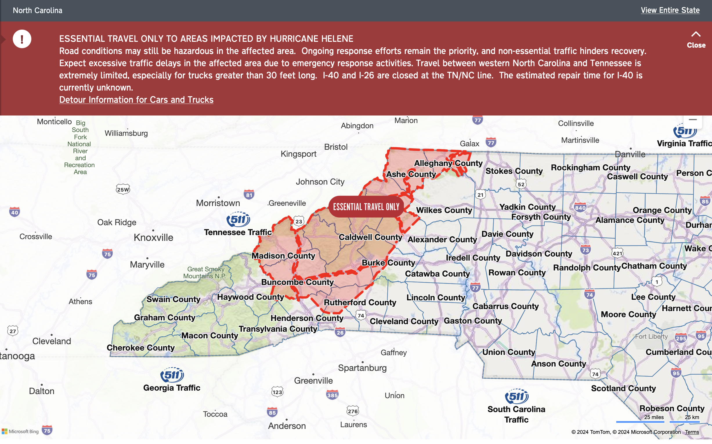 Some areas of Western North Carolina are reopening and ready to accept volunteer help, while many other areas are only open for essential travel. You can check drivenc.gov/ to see road closures and travel limitations before planning to volunteer.