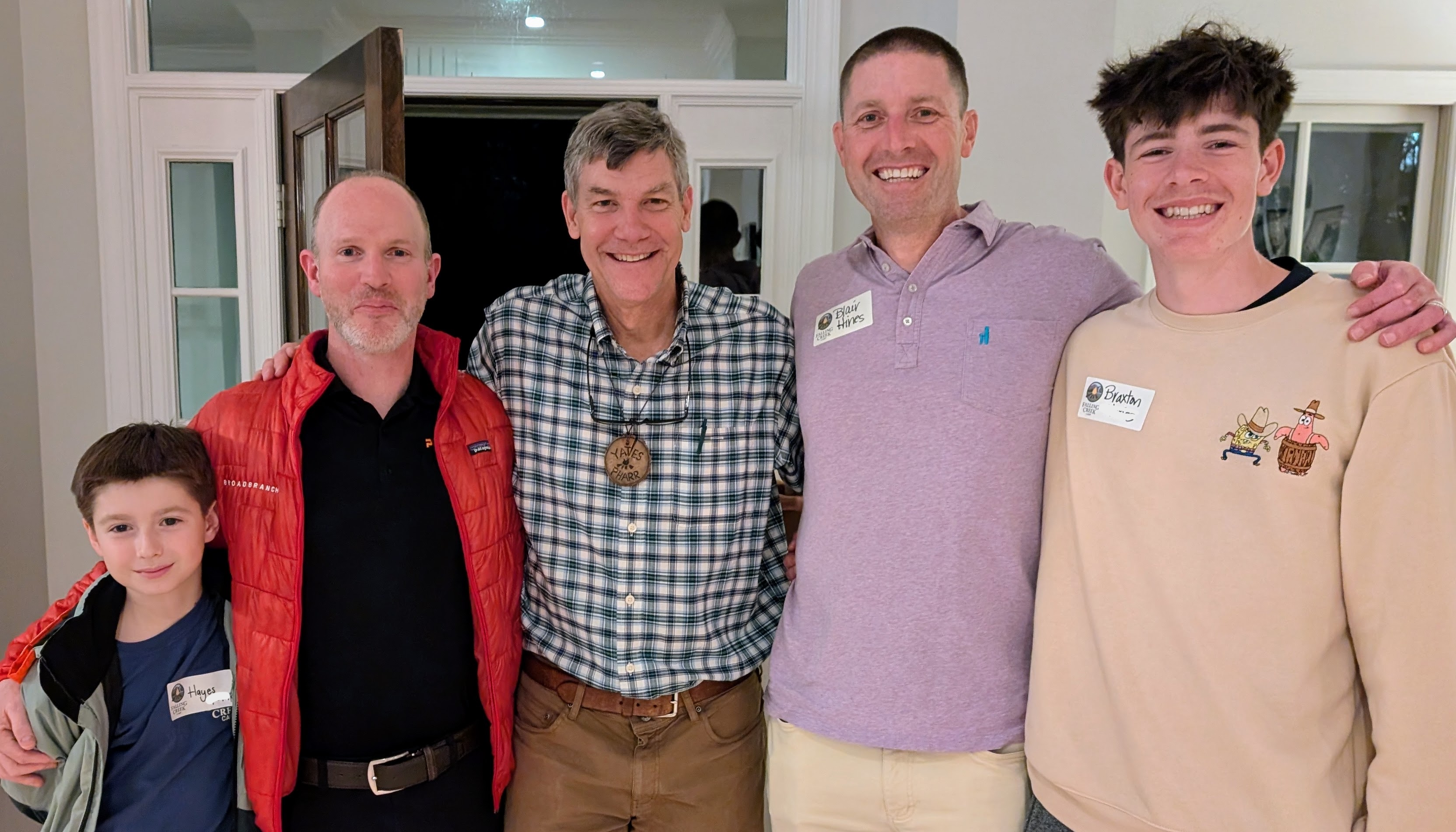 The photo on the right shows a couple generations of FCC – Hayes (camper ‘20-‘25 ), Matt Polak (camper ’90-’94), Yates, Blair Hines (camper ‘83-’90, staff ‘93), and Braxton (camper ’13-’16, ’18-’19).