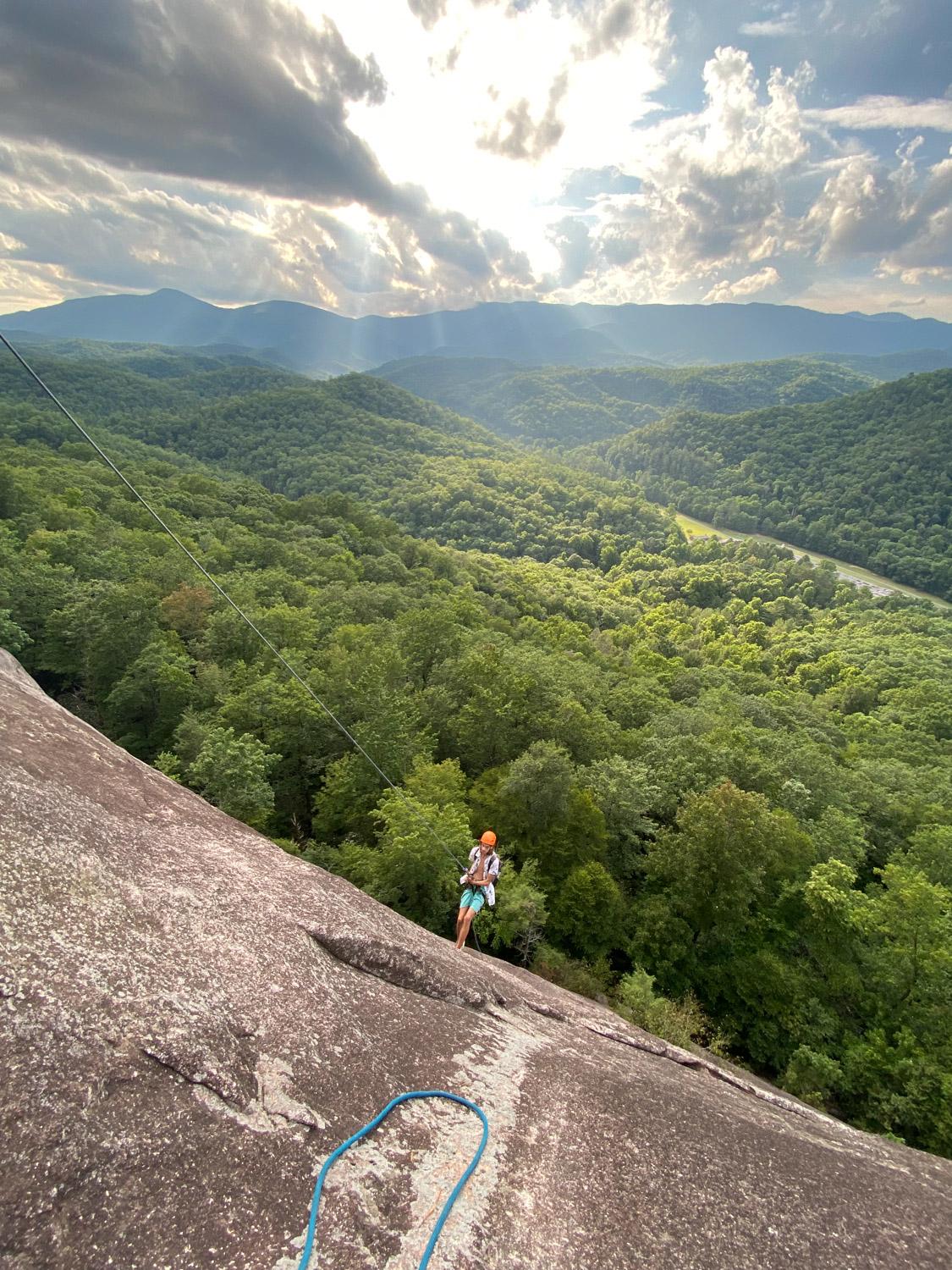 “There was a big Looking Glass rock climbing trip in 2022 that got thundered out in the morning, so we went over to John Rock for lunch. The weather cleared up so we hiked to the top and did a mega rappel off the top of John’s - it was so cool! I went down last, and while on my way down, a massive thunderstorm rolled on top of us. We managed the situation so that we would not get struck by lightning, but once on lower ground we learned that we landed a bit off course.