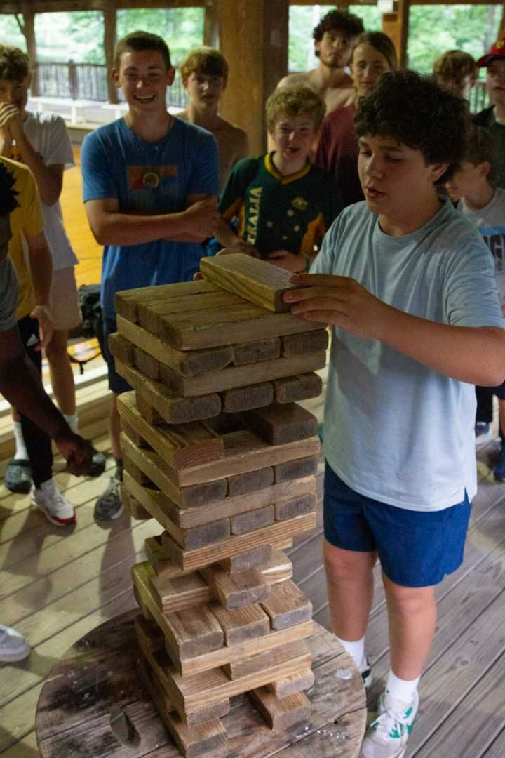 Players from each team will take a turn pulling out a single block for their team. All players will pull before someone goes again. The cabin to successfully pull more pieces will win for their team, or the cabin that does not knock over the tower.