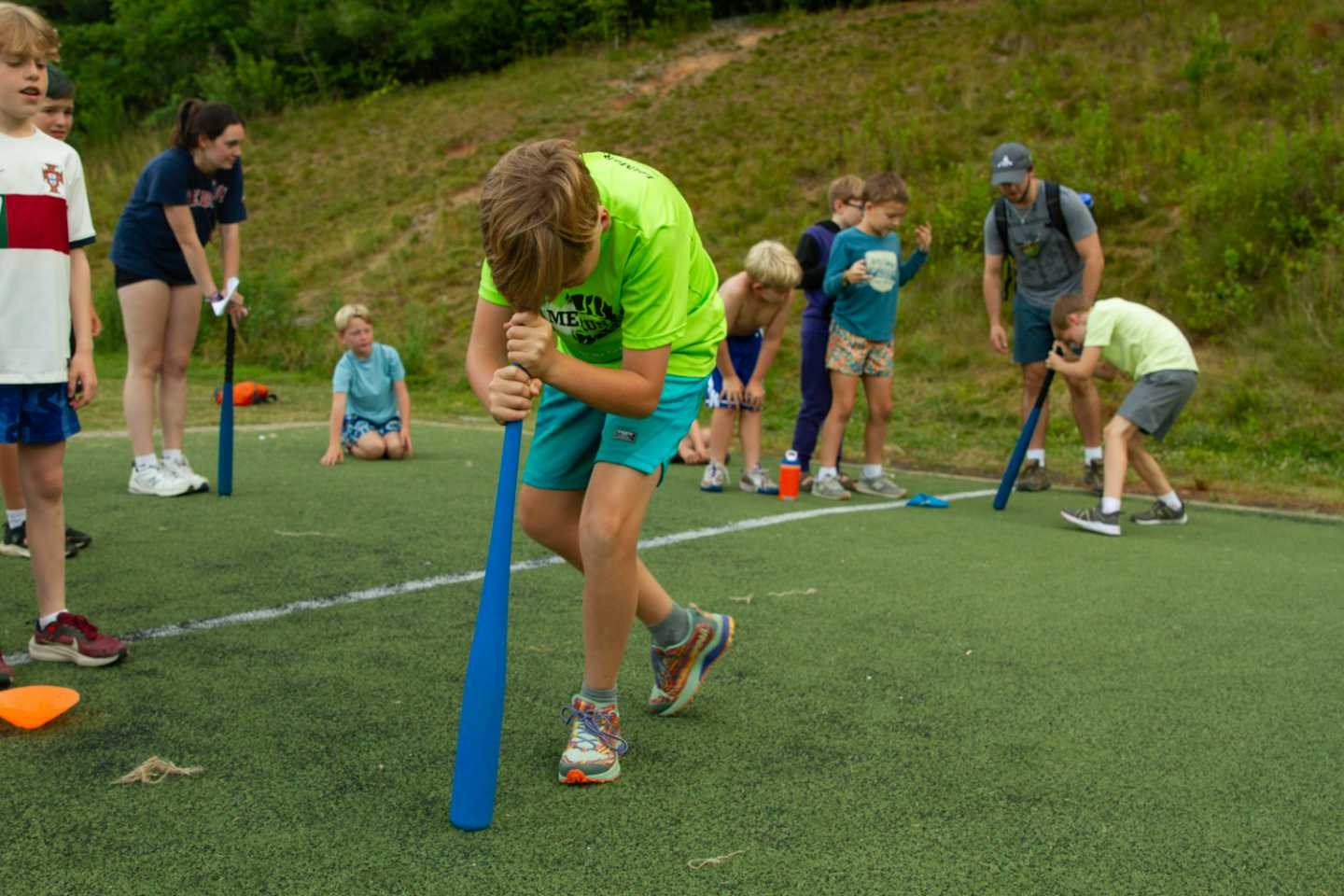 Now, Dizzy Bat is definitely a crowd favorite! Players from each cabin form their own relay lines and take turns. Each player has to spin around 10 times with their head on the bat, looking at the ground in order to get dizzy. Then, while dizzy, each player has to run to the cone and back and then tag the other player. First cabin to finish the relay wins for their team.