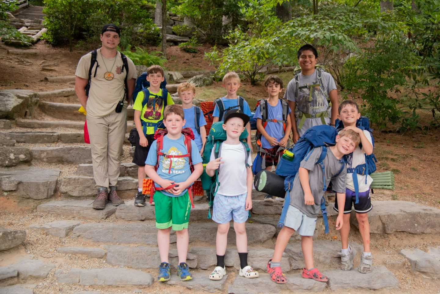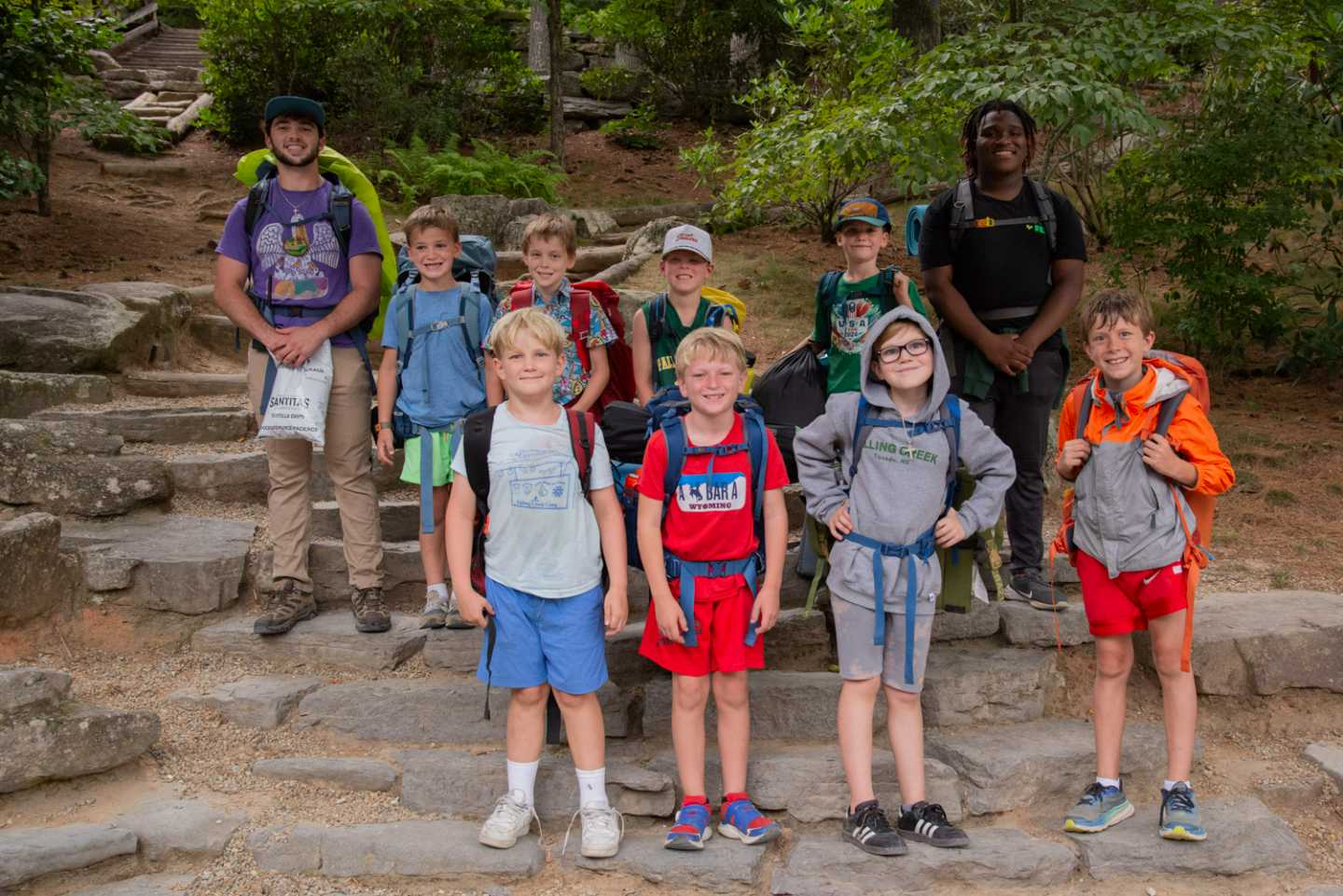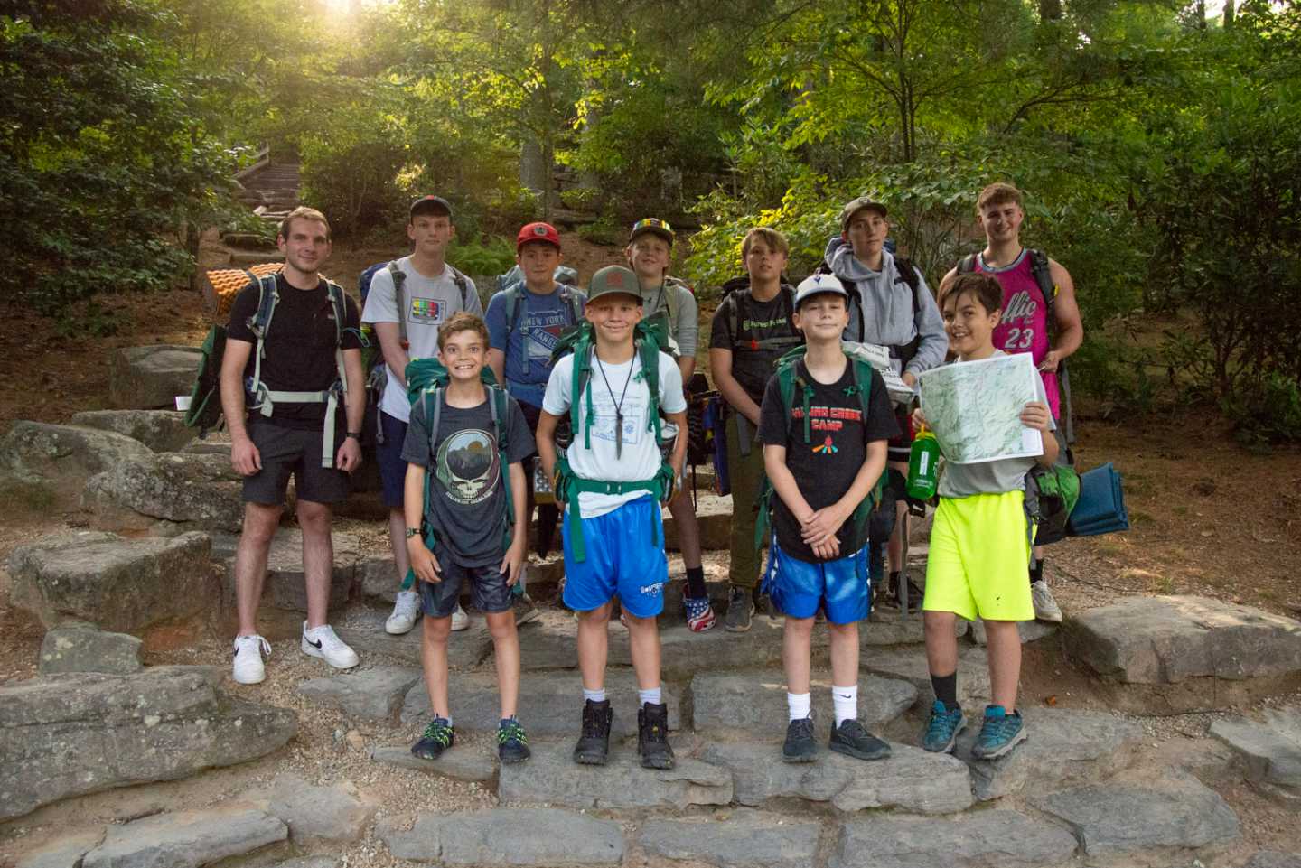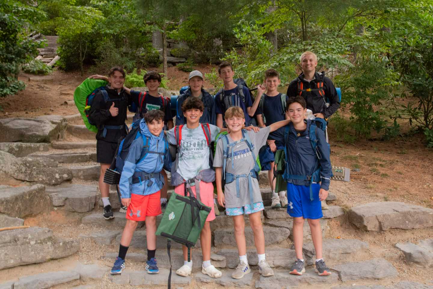 Our Cabin Overnights begin with packing during rest hour and then the boys meet up all together at the beginning of 2nd free period and work as a team to divvy out the food, cooking & shared group equipment, and then work together to pack up all this gear. After taking a group photo, they then hike out as a group to their shelter spot on camp property where they will be resting for the night.
