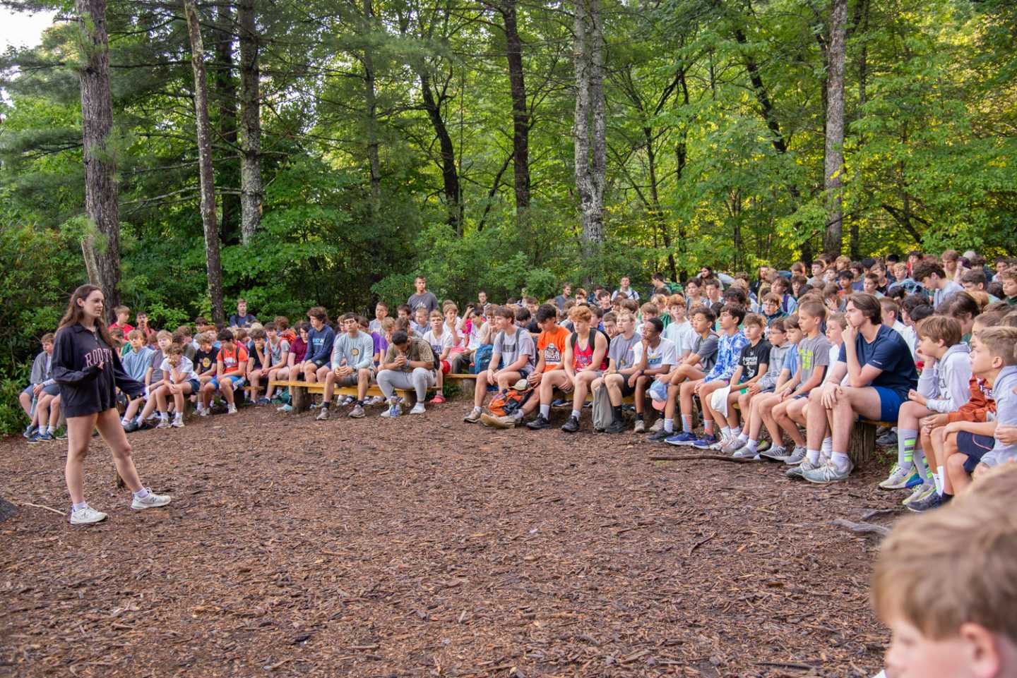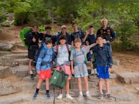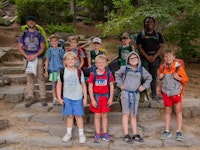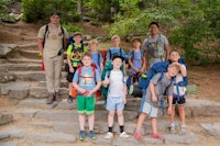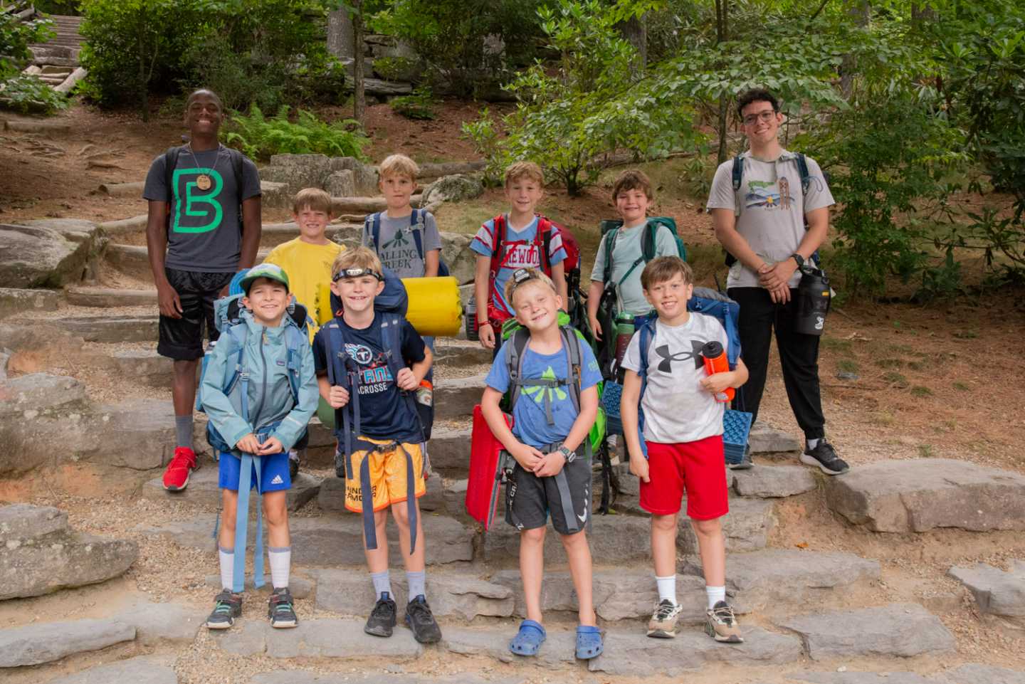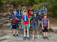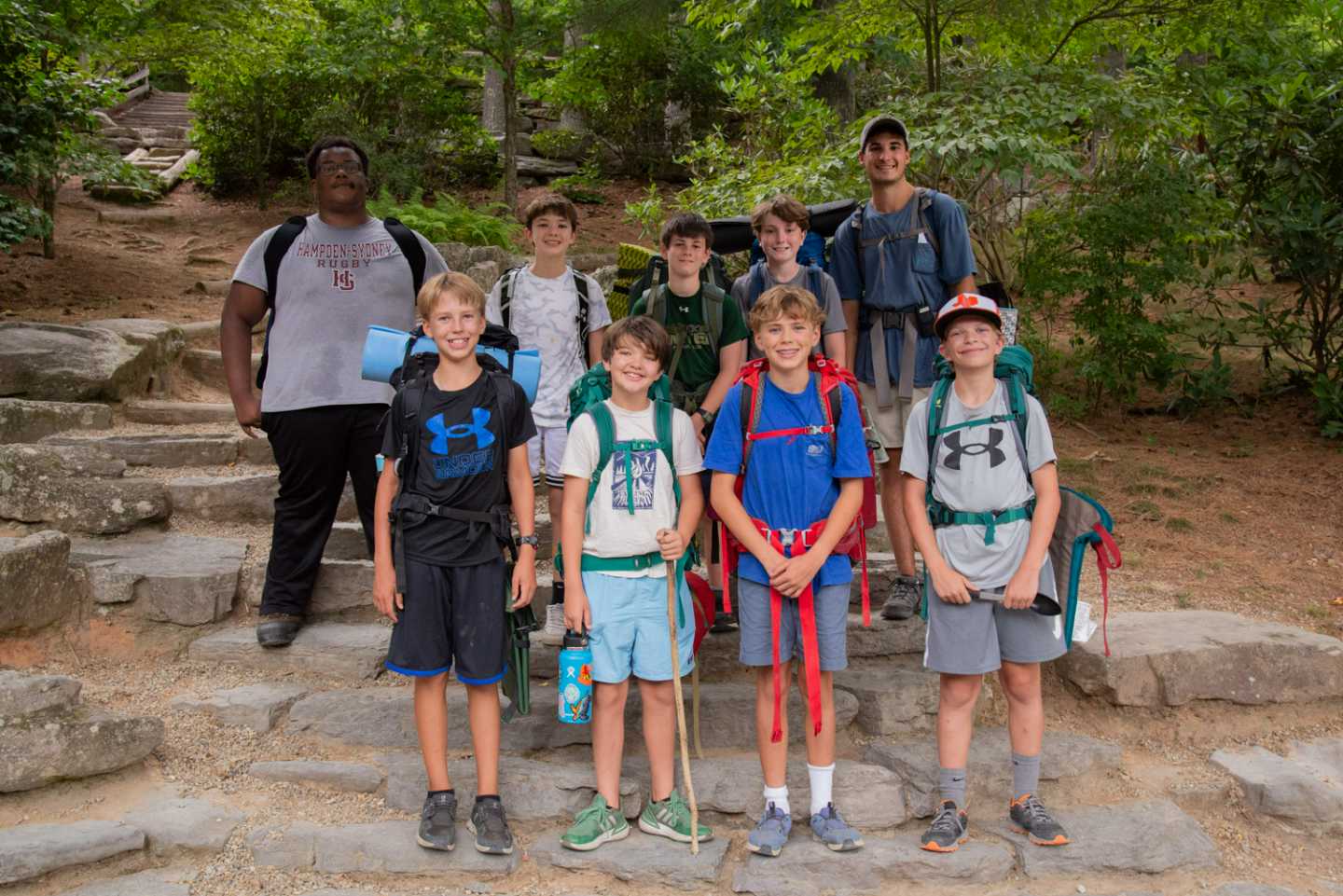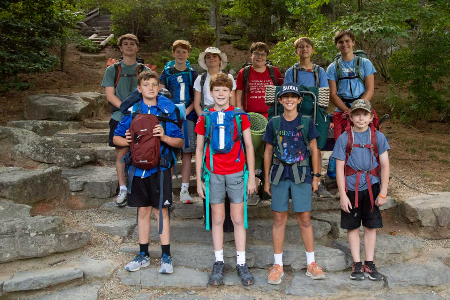 Our Cabin Overnights begin with packing during rest hour and then the boys meet up all together at the beginning of 2nd free period and work as a team to divvy out the food, cooking & shared group equipment, and then work together to pack up all this gear. After taking a group photo, they then hike out as a group to their shelter spot on camp property where they will be resting for the night.