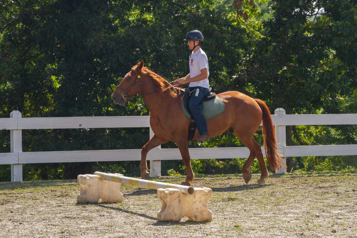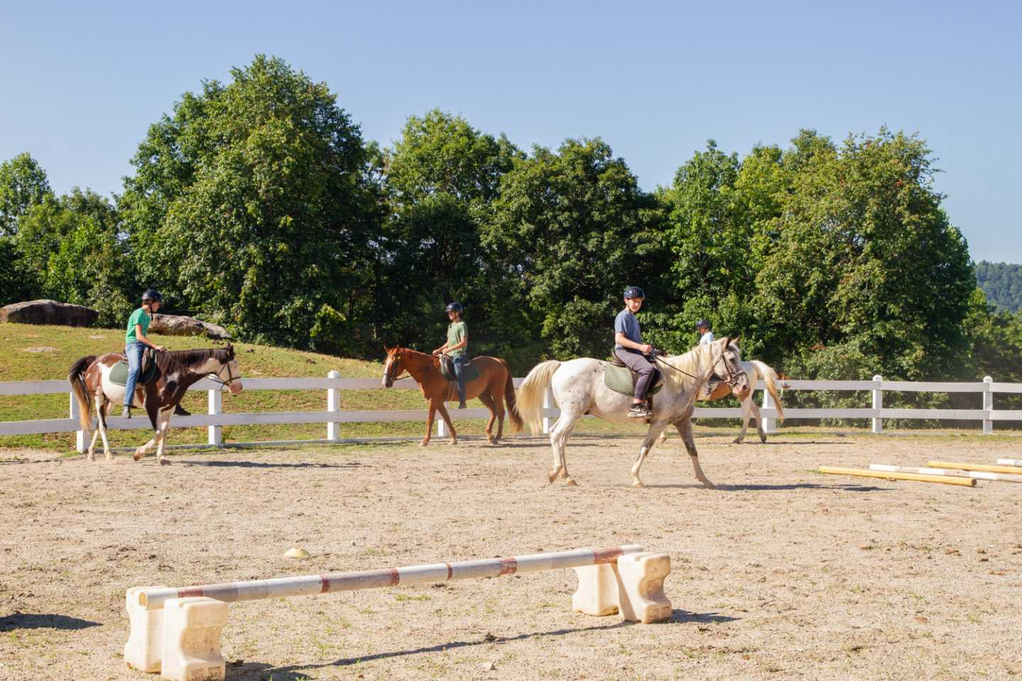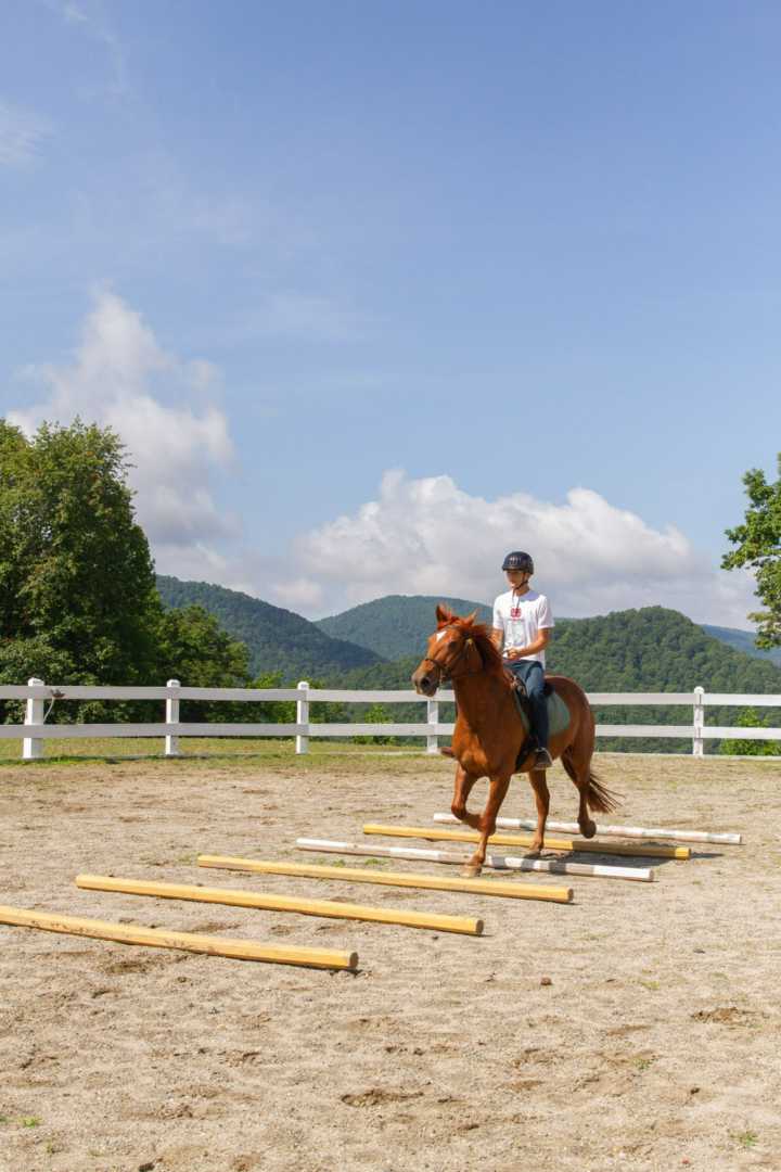 Now, our more advanced riders learn a bit more of the complicated riding techniques. This includes learning how to canter with a horse, as well as mastering the sitting trot. The boys also do some stirrupless riding. They will learn about strides, timing and adjusting speeds. They practice this by cantering over poles laying on the ground. The more advanced rider will also learn and practice show jumping. Today, the boys were jumping 30cm jumps with the horses.