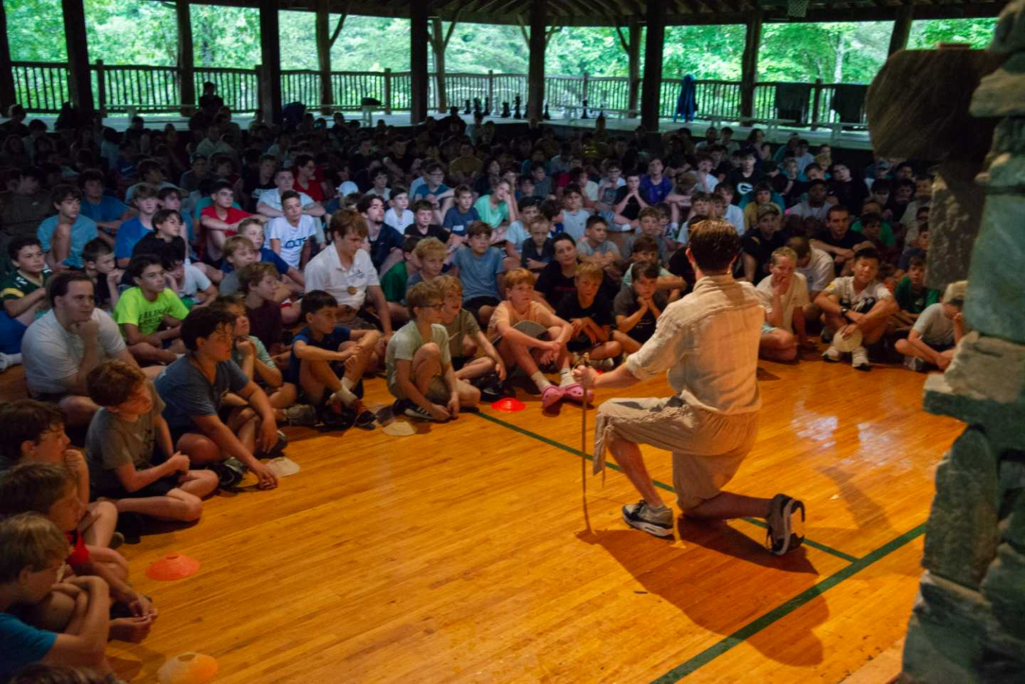 Campfire is a long-lasting camp tradition that happens every Sunday at Falling Creek. We enjoyed our first campfire of the session to welcome the boys, although we couldn’t enjoy it in our traditional space because of some rain, we still retained the tradition by enjoying it in McGrady Gym. We all came together to share an evening filled with songs, hilarious skits, meaningful stories, as well as some important announcements about the session ahead.