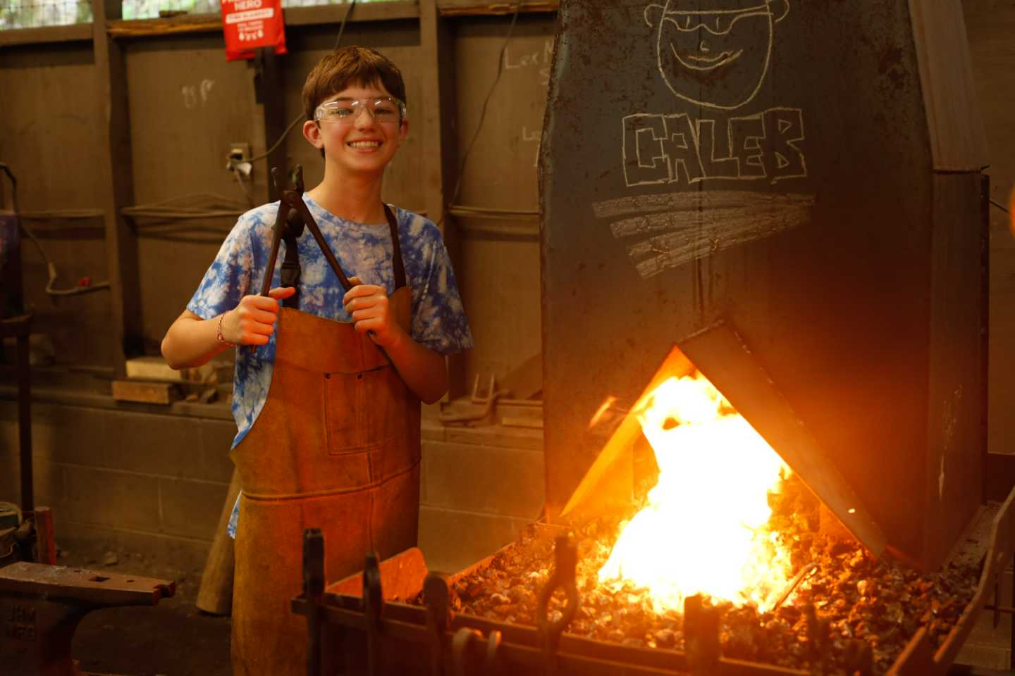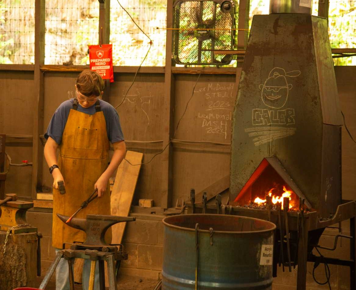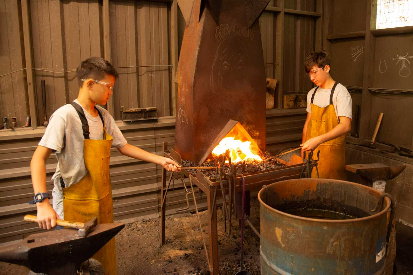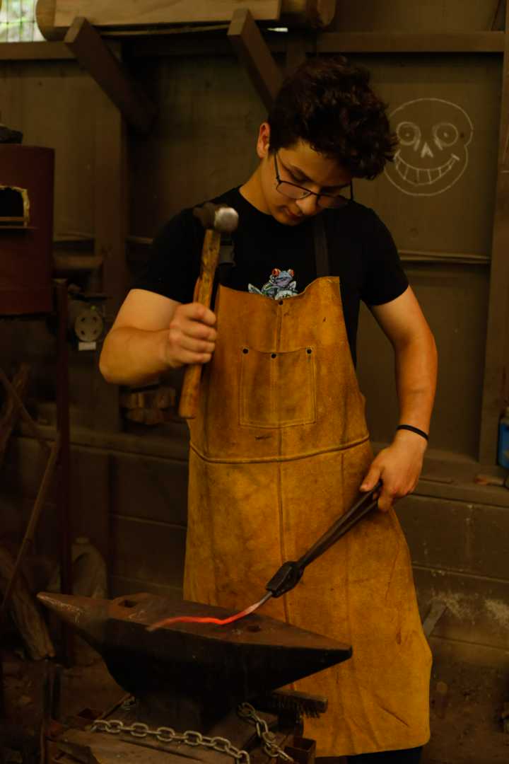 The projects at blacksmithing encompass creating a range of objects, from decorative arrow heads used as jewelry to fully functional throwing axes. David Echeverria, the lead at Blacksmithing, spoke about how the progressions are designed to help the boys grow in their skills as they build into each other, slowly progressing in difficulty. He said he prides himself in being able to help the campers grow in skill as well as in their confidence.
