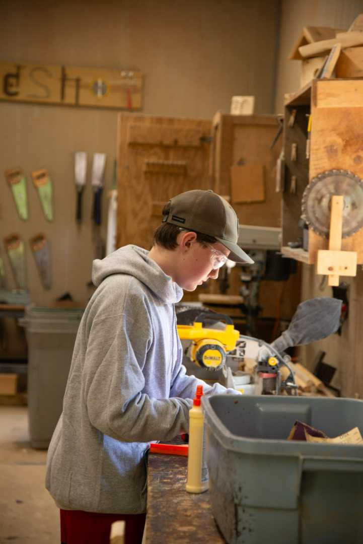 Simon H. is in his 5th year at Falling Creek and is working on becoming a Ranger in Woodworking. He is currently working on crafting a mitered angled box, which will be joint on a 45° angle as opposed to 90°. Simon says he enjoys woodworking because he loves making a finished product, knowing the attention to detail goes into each project.