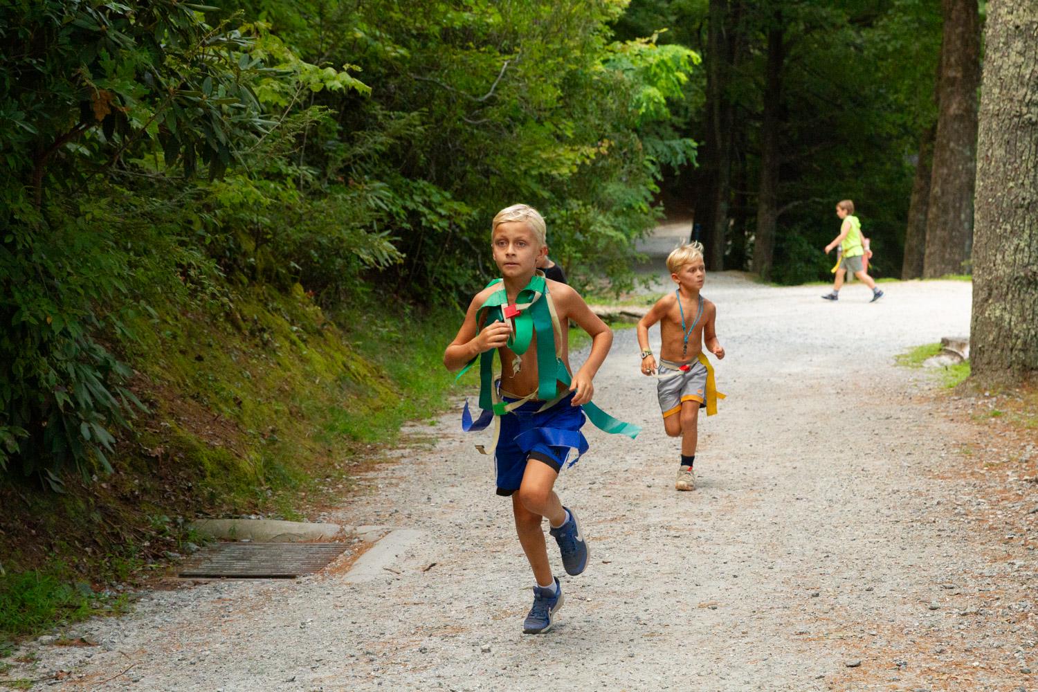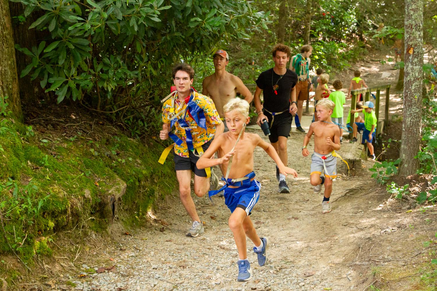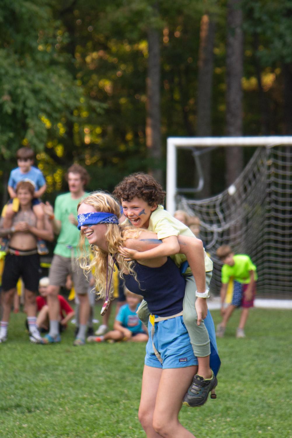Blindfolded Counselor Hunt: How well do you communicate with your counselor? Let’s test that with our blindfolded game. The counselors had to race to the cone and back with a camper on their backs. The campers must help guide the counselor, they may tug his ear or use voice commands. First counselor back on their team wins.