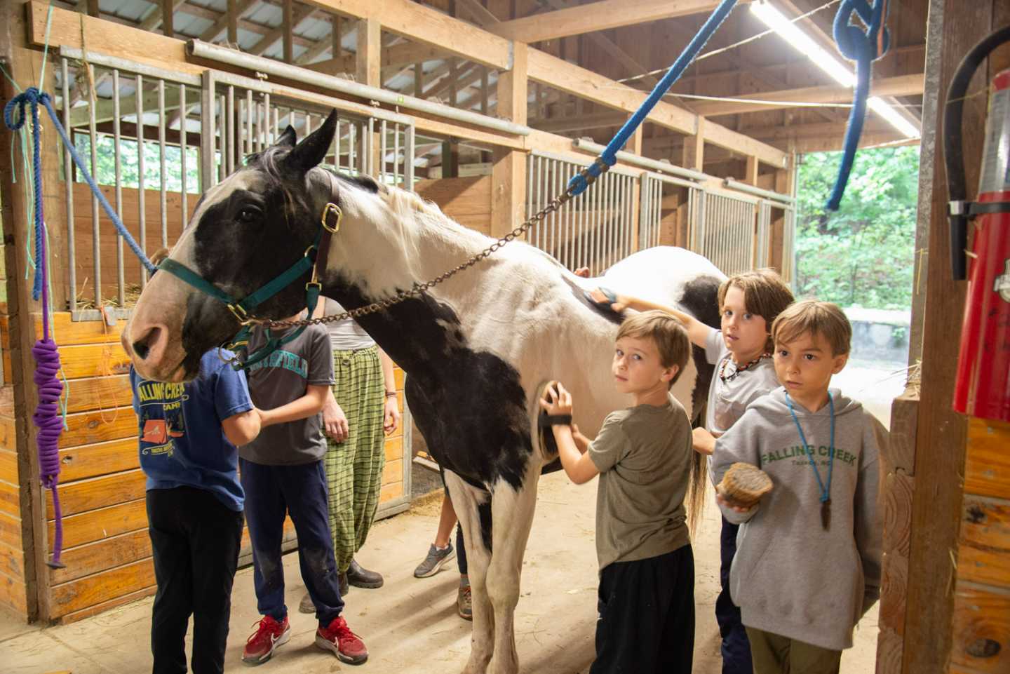 Horseback Riding: The boys learn about horse care, including how to brush and groom the large majestic animals. They get to know the animals on a ground level first before hopping onto their backs. Once they have groomed the animals, they enjoy a lovely little ride around the ring being led by a trusted camp counselor.