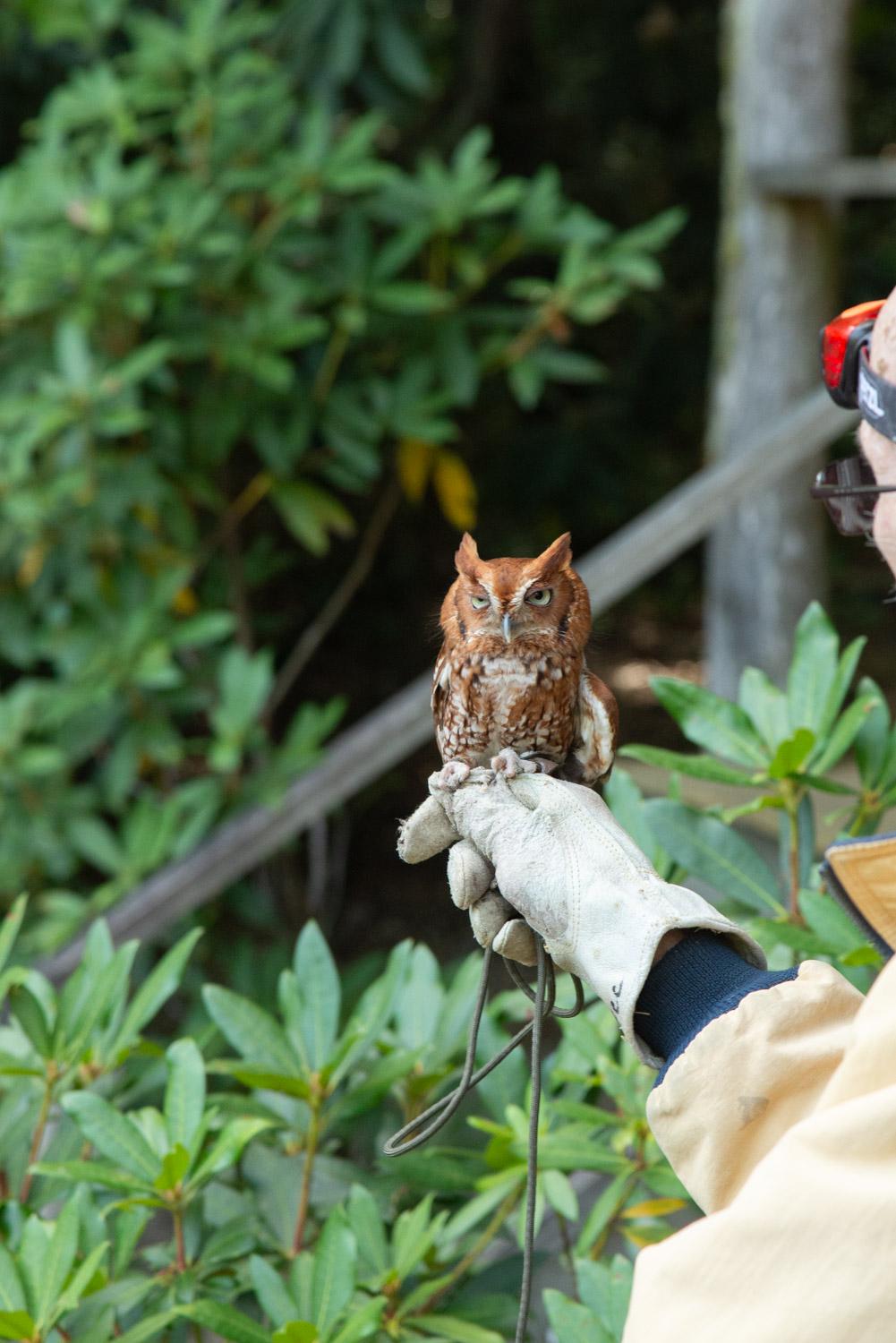Eastern Screech Owl: a nocturnal predator, relying on its excellent night vision and acute hearing to locate prey in the dark. It hunts from a perch, silently swooping down to catch insects, small rodents, or other small animals, which it then swallows whole.
