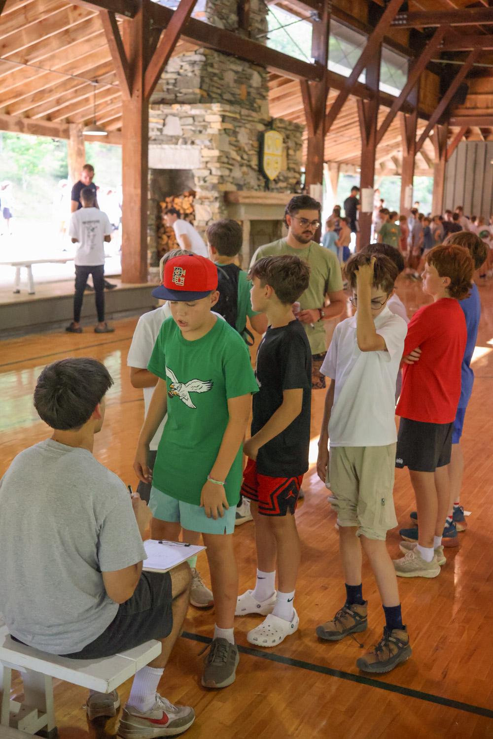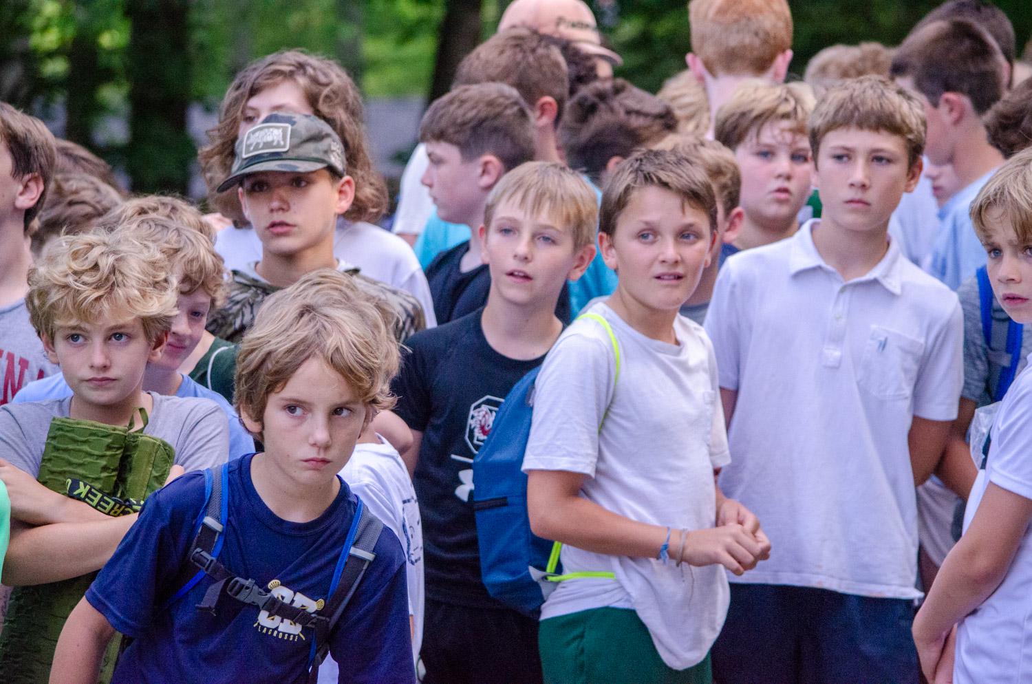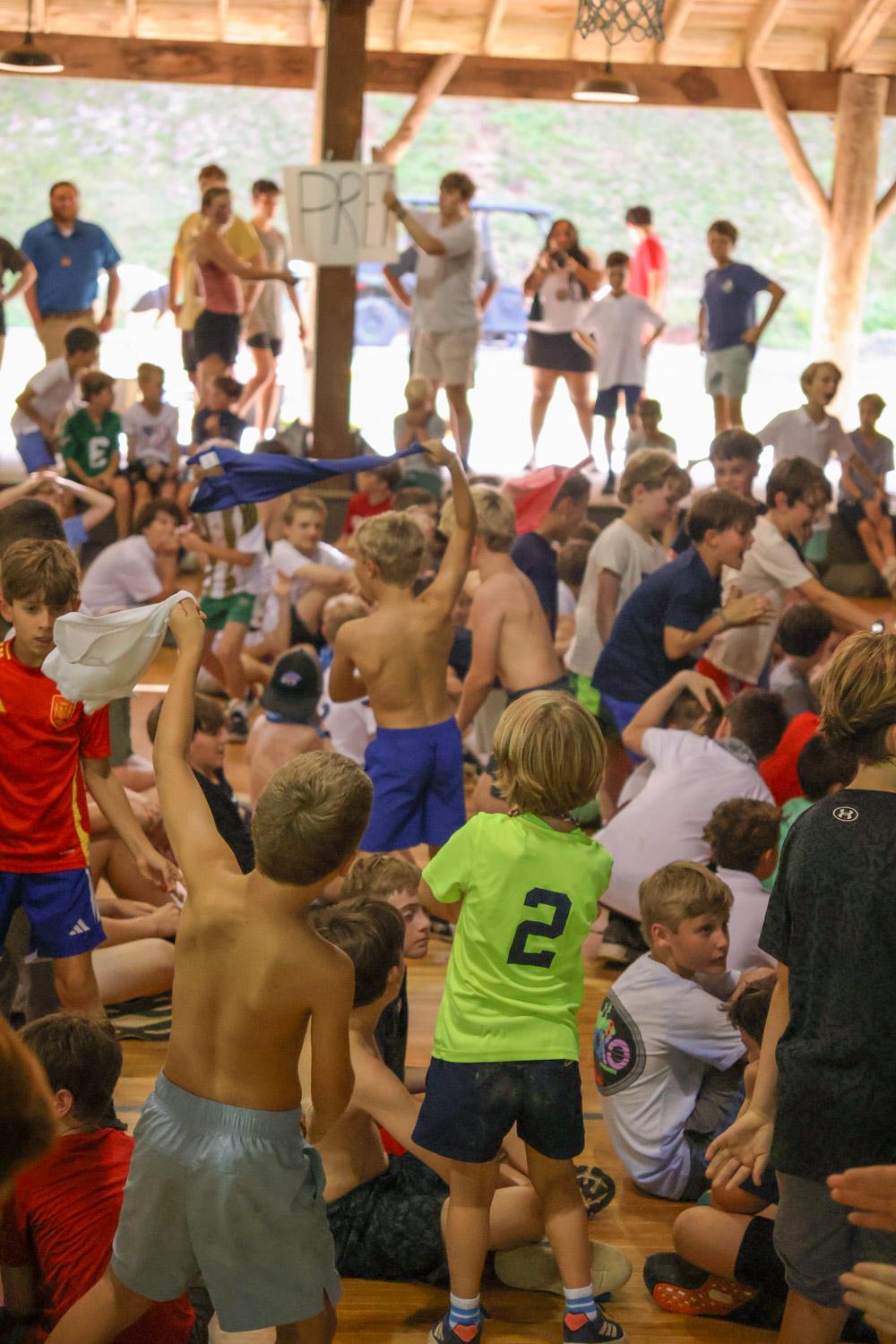 After cleaning, campers change into white shirts and head to our outdoor church service. Falling Creek is a Christian camp with a non-denominational service focused on values we can all grow from. This week’s theme: Courage. Campers listened, sang, laughed at skits, and reflected on how they can be brave — whether by speaking up, trying something new, or showing up for others.
