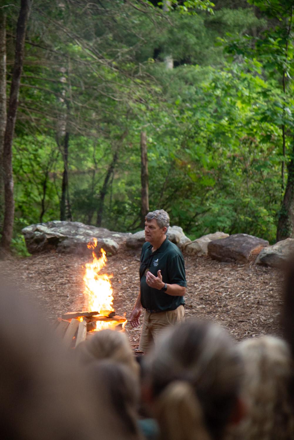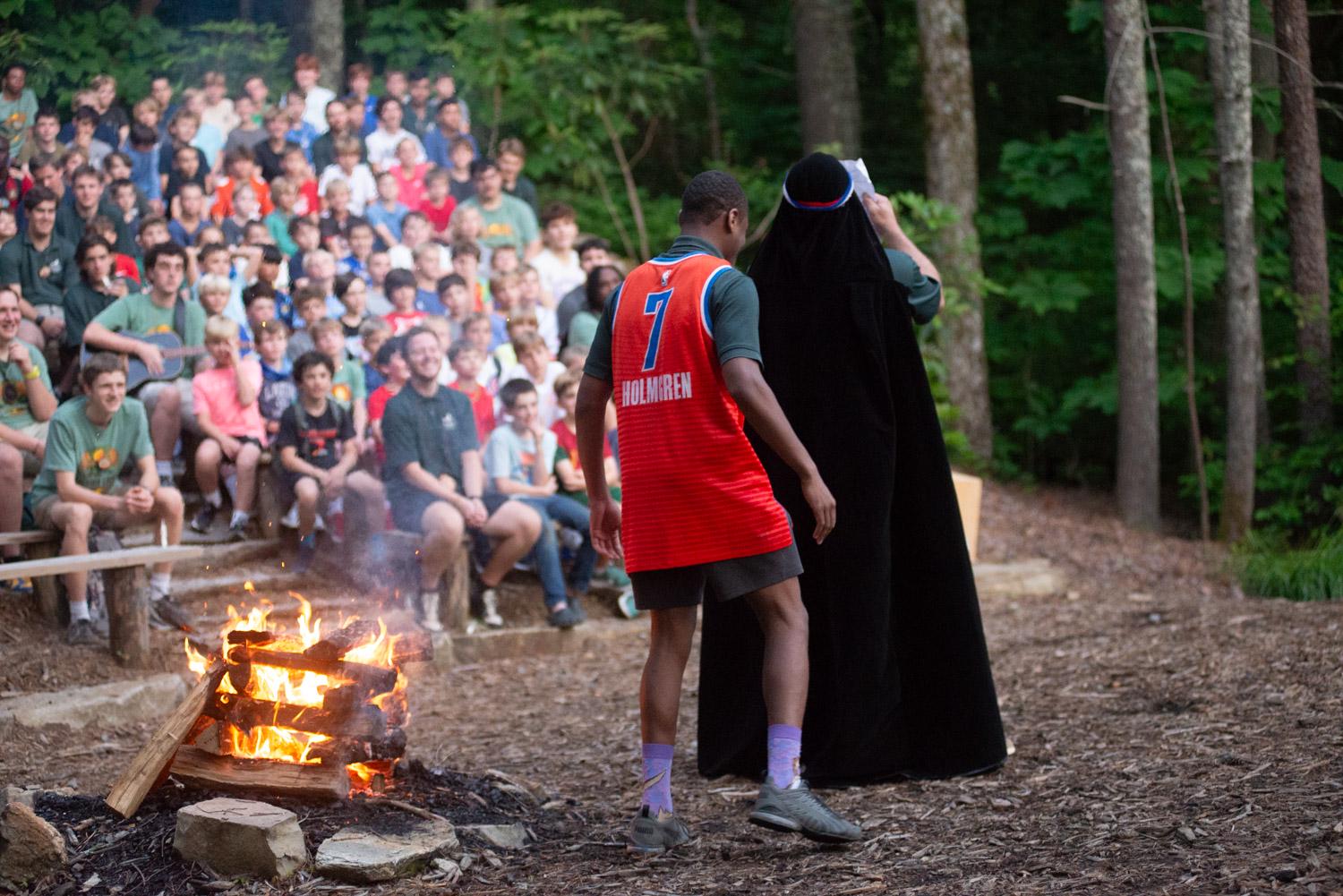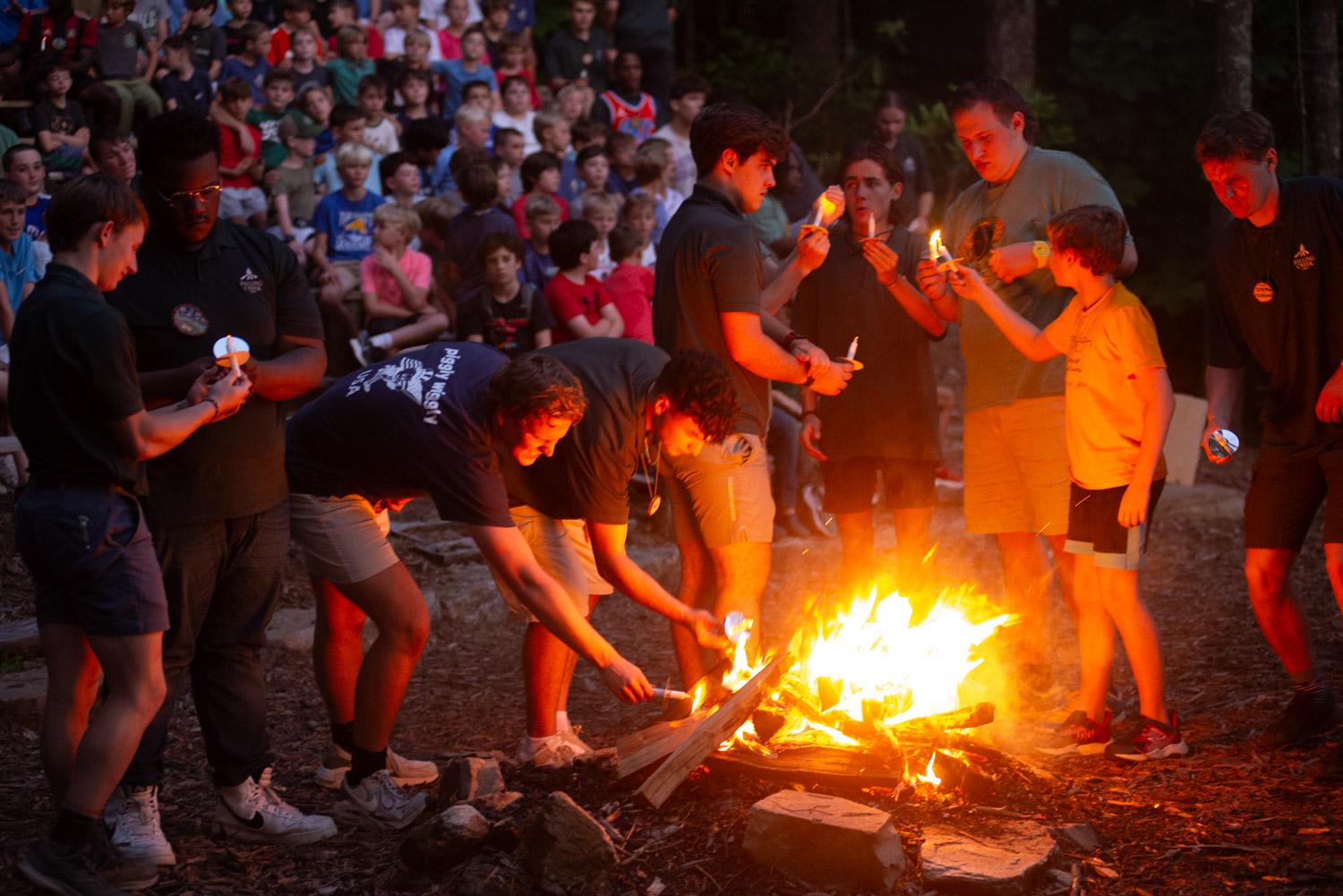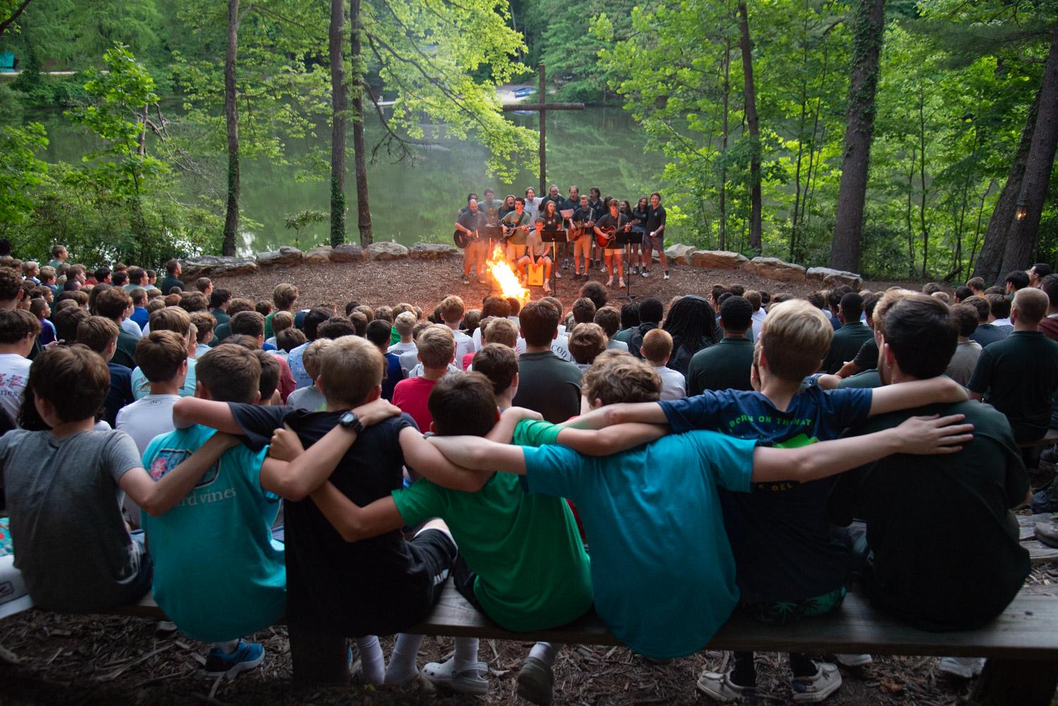 As the sun set, campers walked silently across the bridge to Campfire. The sounds of the day faded into the crackle of flames and the soft croaks of bullfrogs near the lake. Cabins sat close together, swaying slightly as they sang.