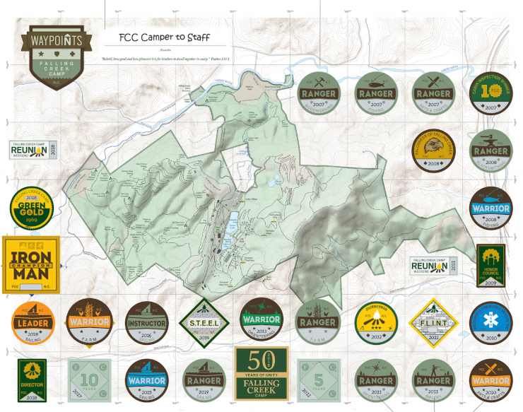 Every first-year camper receives a personalized Falling Creek map—a keepsake to mark their journey. As boys meet progression milestones in different activities, they’re awarded special Waypoint stickers to place on their map, commemorating the goals they've reached along the way.