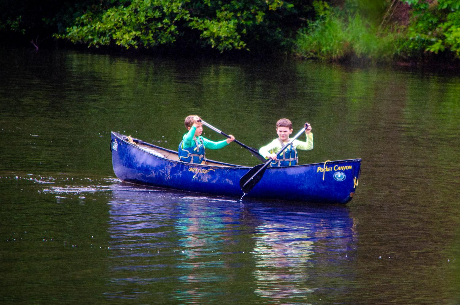 The boys got in canoes with their partners and set off to explore around the lake. “Remember to think backwards when paddling a boat,” said Evan. “The harder you pull backwards, the faster you go forwards.” There’s a learning curve to controlling a canoe, but everyone was getting the hang of things quickly.
