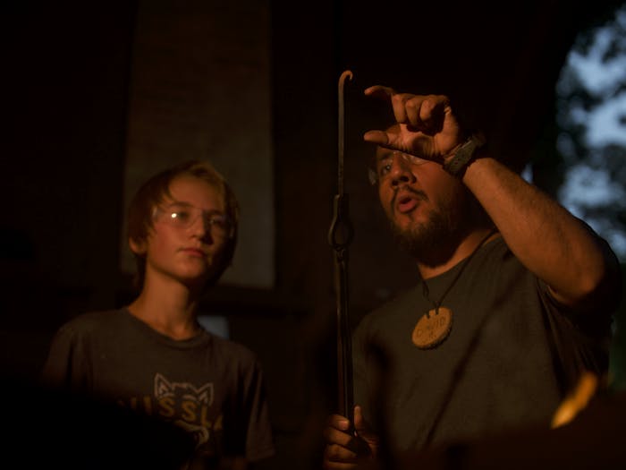 The orange glow of the forge reflects in his dark rectangular glasses as Farid “Reid” Davis-Henaine demonstrates to a camper the art of heating and st...