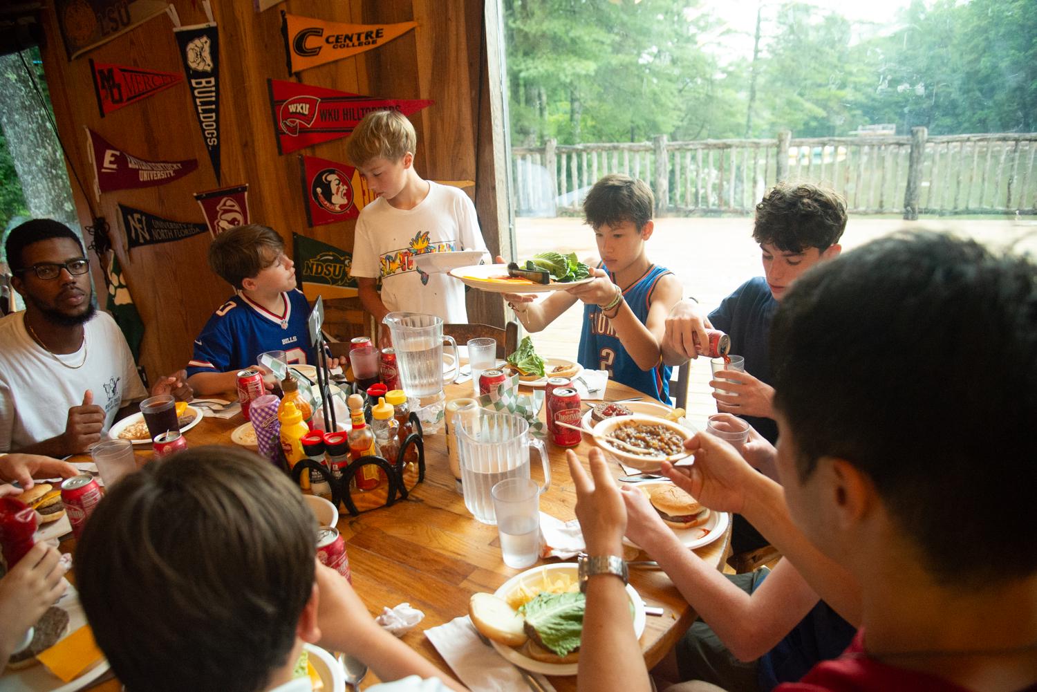 You’ll eat breakfast, lunch, and dinner family-style with your cabin mates and counselor in the Dining Hall. This means that the food is put on your cabin’s table right before you walk inside, and you and your cabin mates fill your plates from the serving bowls, just like you would at home.