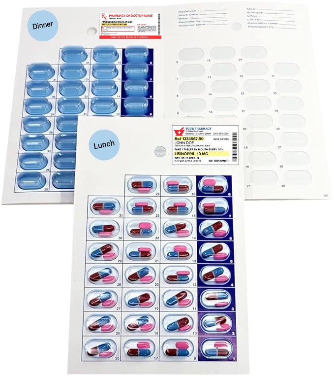 For example, if medication A is taken daily at breakfast, we need (1) blister-pack for medication A. If medication A is taken at breakfast and dinner, we need 2 blister packs for medication A. If 2 medications are taken at the same time of day, they may be packaged together or in separate blister packs.