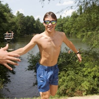 The Ironman competition involves swimmin the lower and upper lakes, then mountain biking close to a four-mile route on our single-track trails and camp roads, which take racers over to the ball field for the transition to the run. They run a tough three-mile course that brings them back to the ball field, where they hear the sound of the music blaring and cheers from the rest of the camp as they cross the finish line in triumph.
